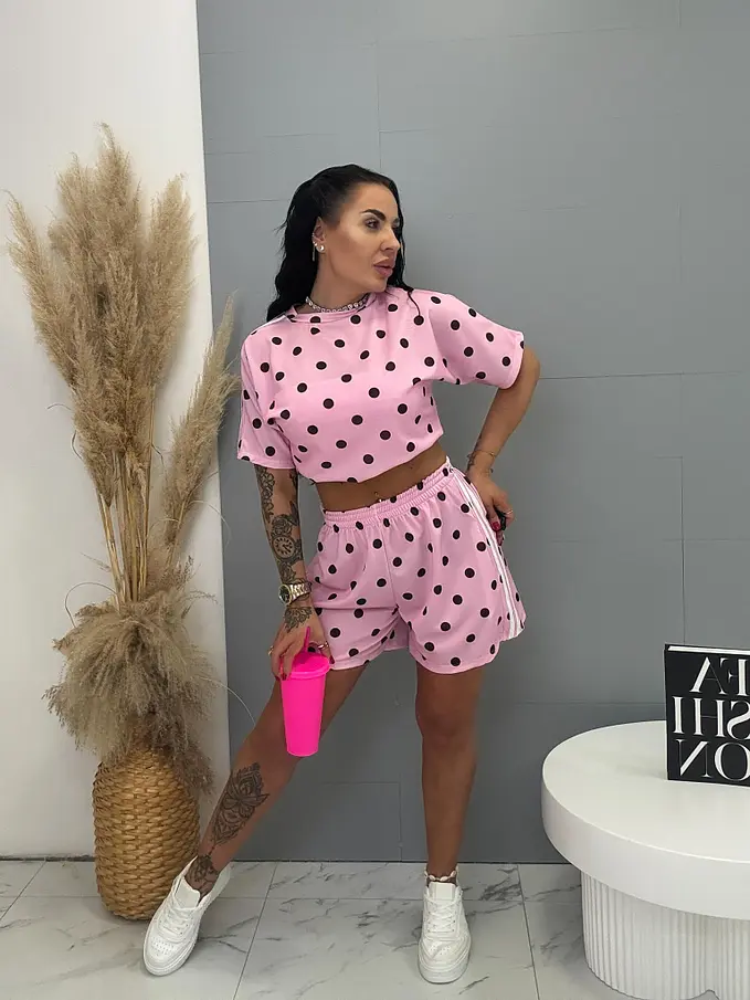 Dámsky komplet z novej kolekcie. Pozozstáva sa z trička a šortiek. Nohavice majú gumený pás. Materiál je príjemný, elastický. S bočnýni vreckami.