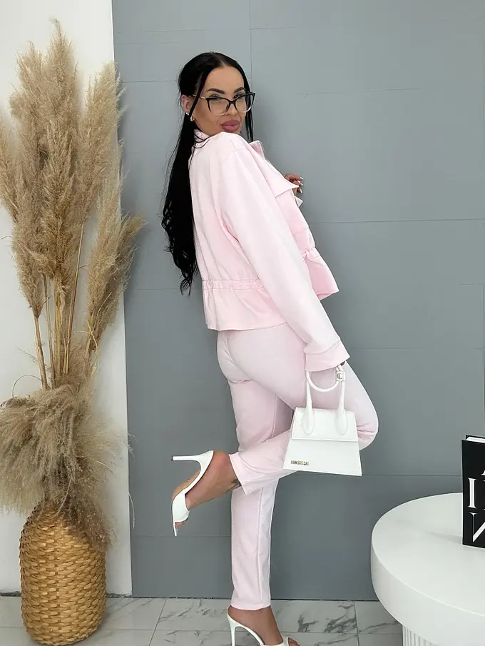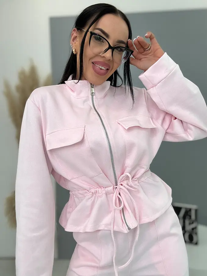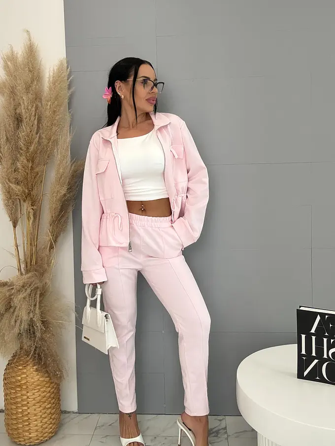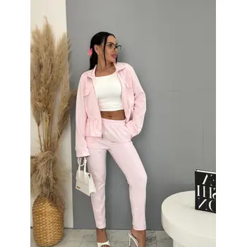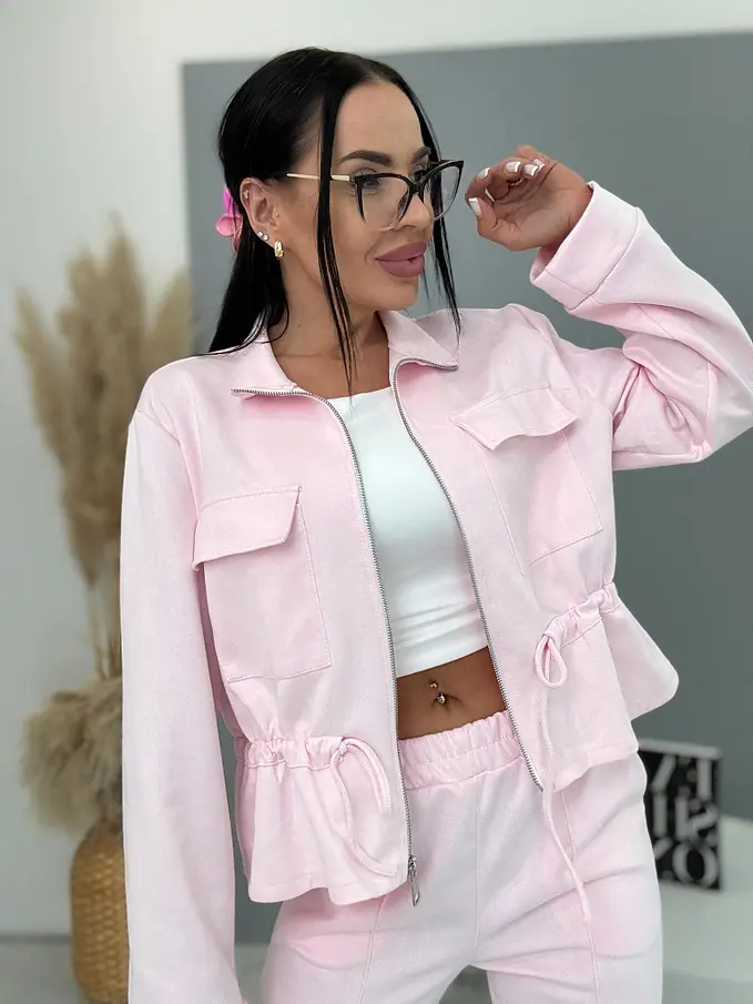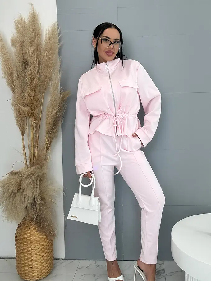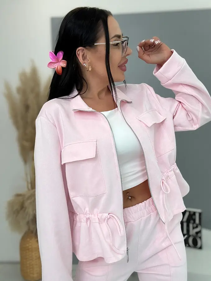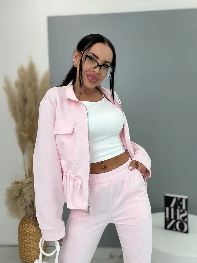 Dámský komplet z novej kolekcie. Pozostáva z mikiny so zipsom a nohavíc. Materiál je príjemný, elastický. Nohavice s gumeným pásom a bočnými vreckami. Mikina s prednými vreckami a viazaním v páse.
