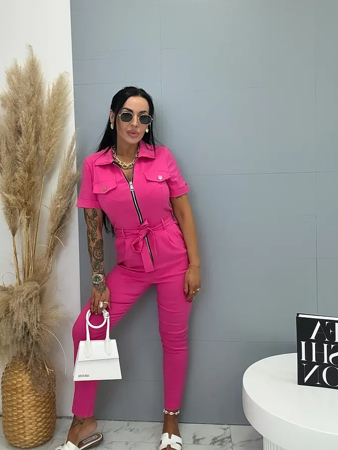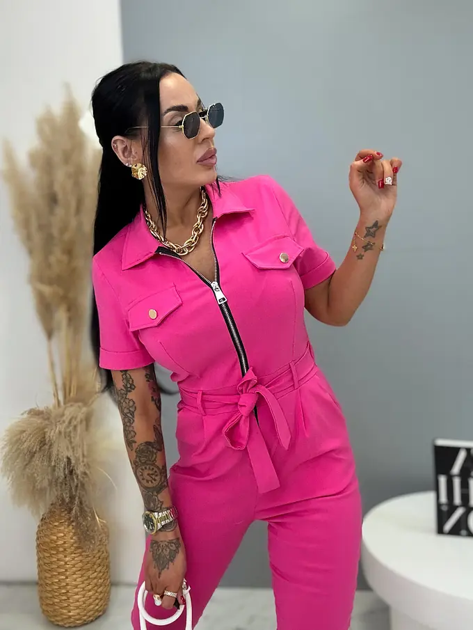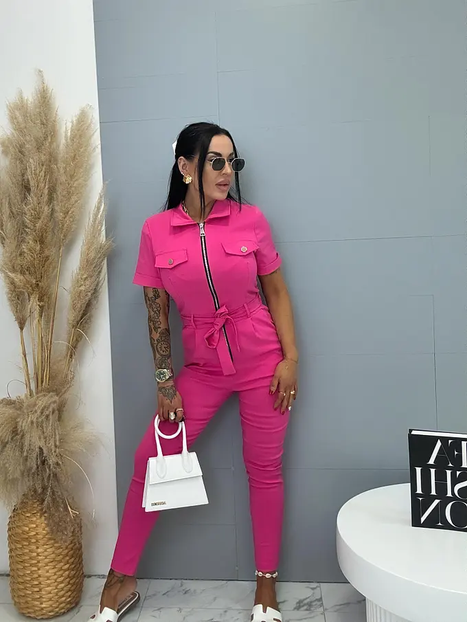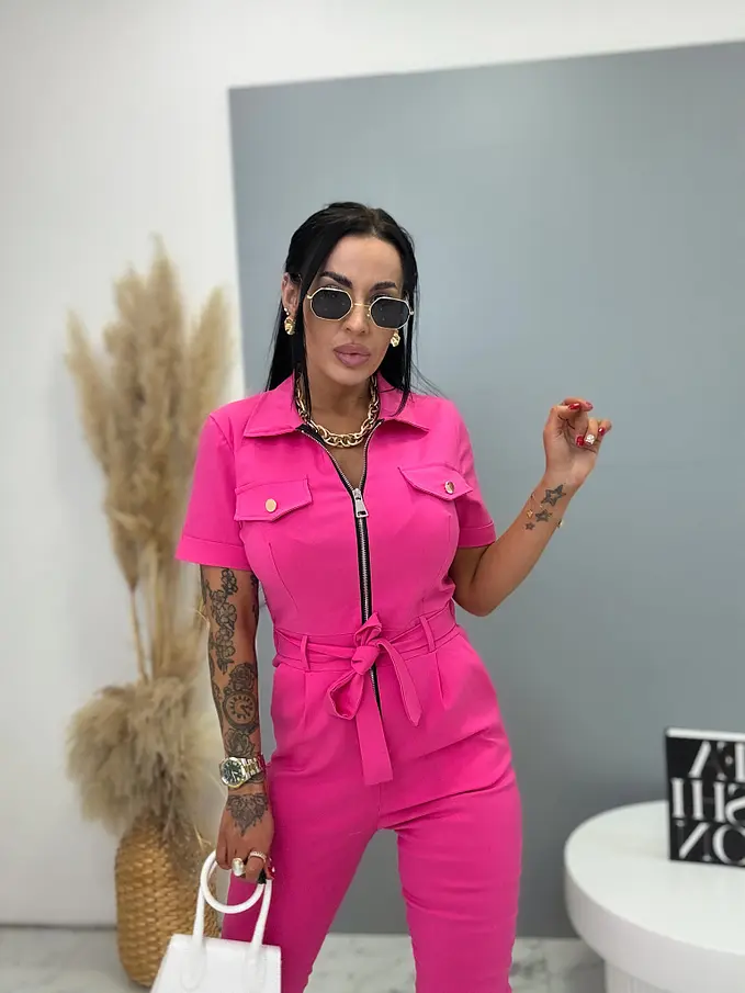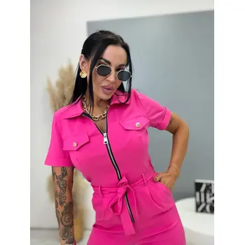 Overal s krátkym rukávom a golierom je štýlový a praktický kúsok do každého šatníka. Je vyrobený z extra elastického materiálu, ktorý zaručuje maximálne pohodlie a voľnosť pohybu. Zapínanie na zips uľahčuje obliekanie a zároveň dodáva moderný vzhľad. Model dopĺňa opasok, ktorý zvýrazní pás a vytvorí lichotivú siluetu. S bočnými vreckami, čo zvyšuje jeho praktickosť. Je ideálny na každodenné nosenie aj na voľný čas.