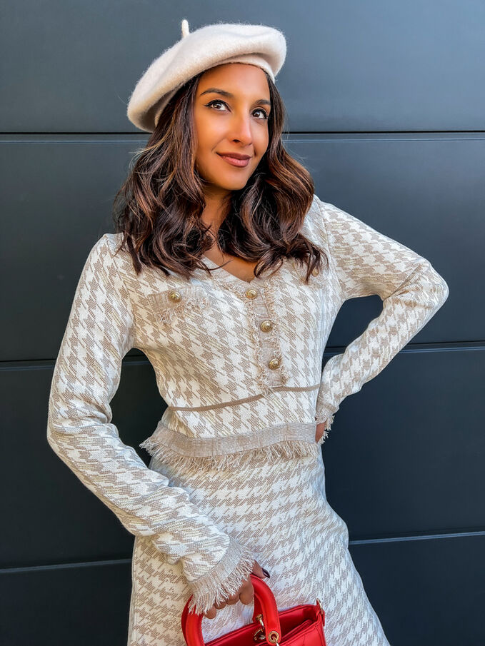 Modelka brunetka meria 158 cm a váží 50 kg. Nosí veľkosť S.