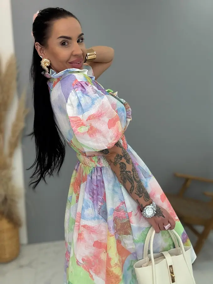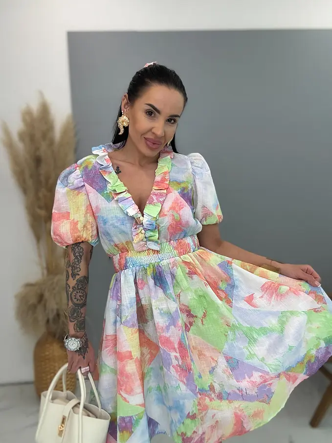 Farebné šaty s gumeným pásom. Materiál nie je elastický.