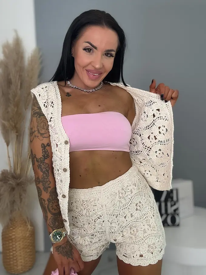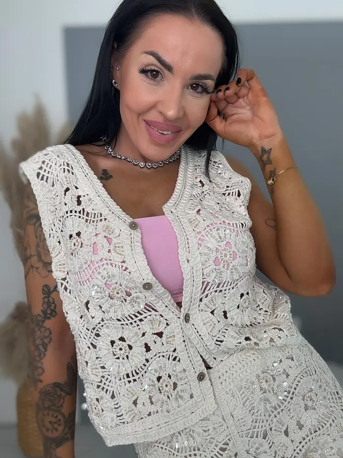 Háčkovaný komplet s flitrami a perličkami, ktorý musíte mať. Komplet sa pozostáva z vestu a krátke nohavice. Gombíky sú drevené.