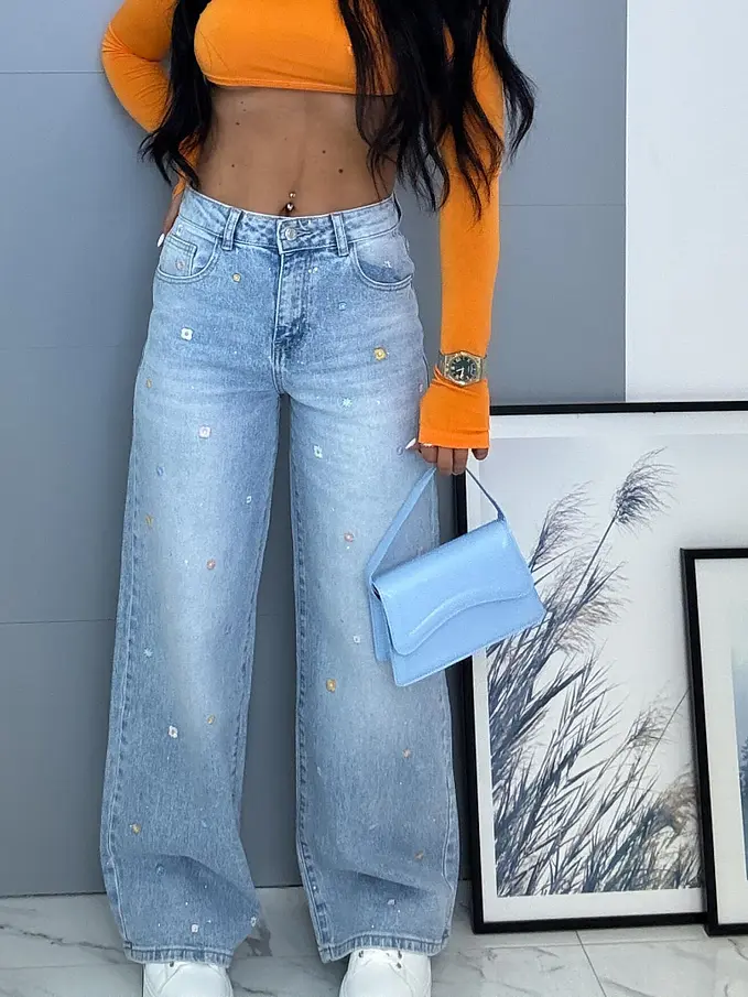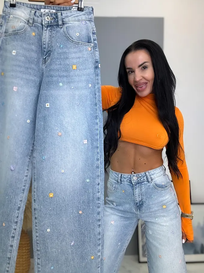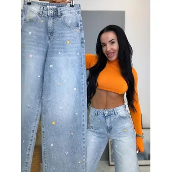 High Waist rifle s výšivkami a kamienkami
