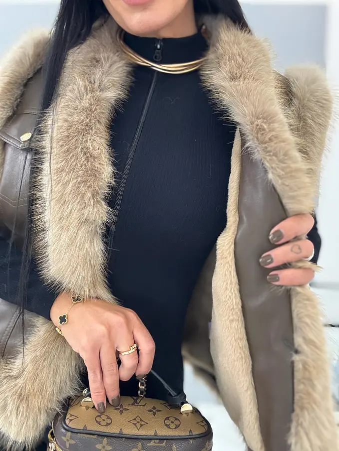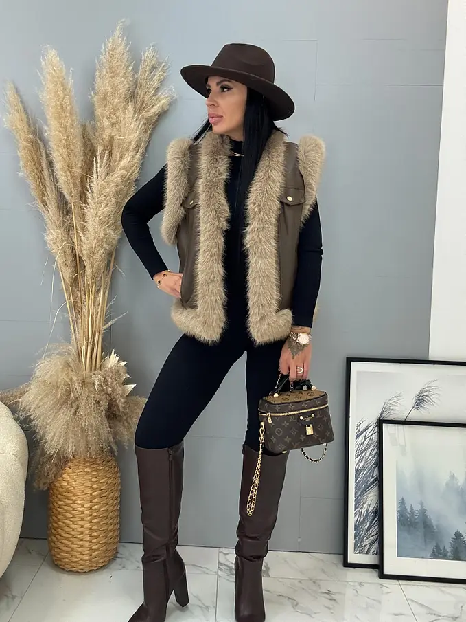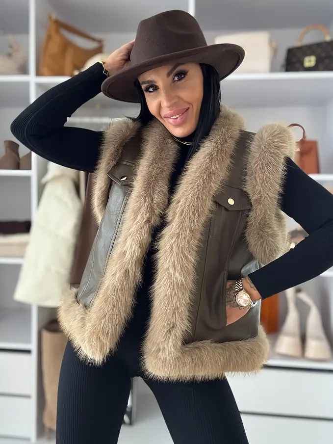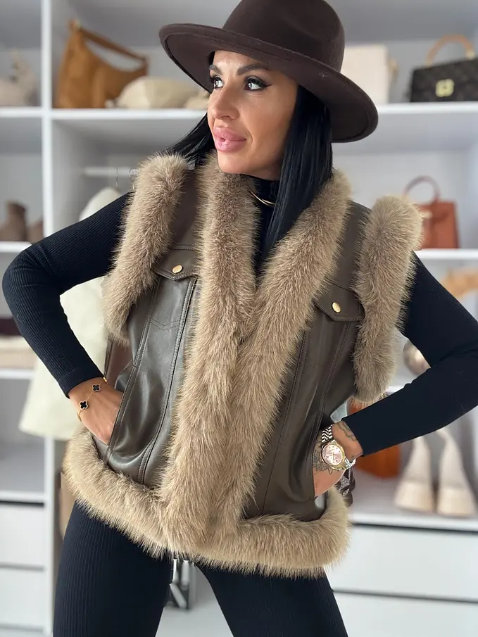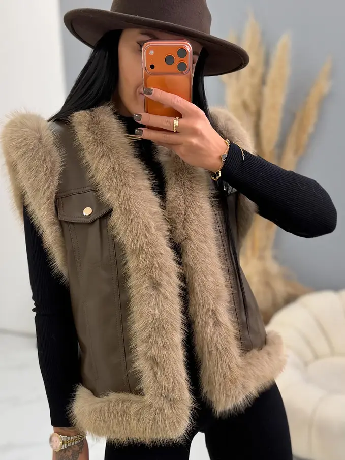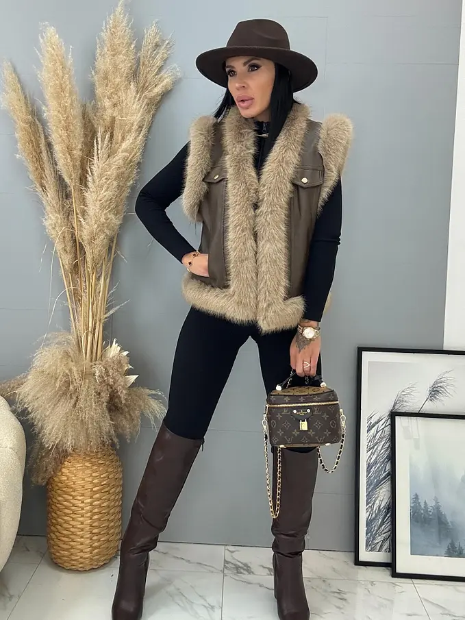 Kožená vesta s kožušinovým lemom. Podšitý mäkkým, príjemným kožúškom. Detaily sú v zlatej farbe. S bočnými vreckami v prednej časti. So sponovým zapínaním.