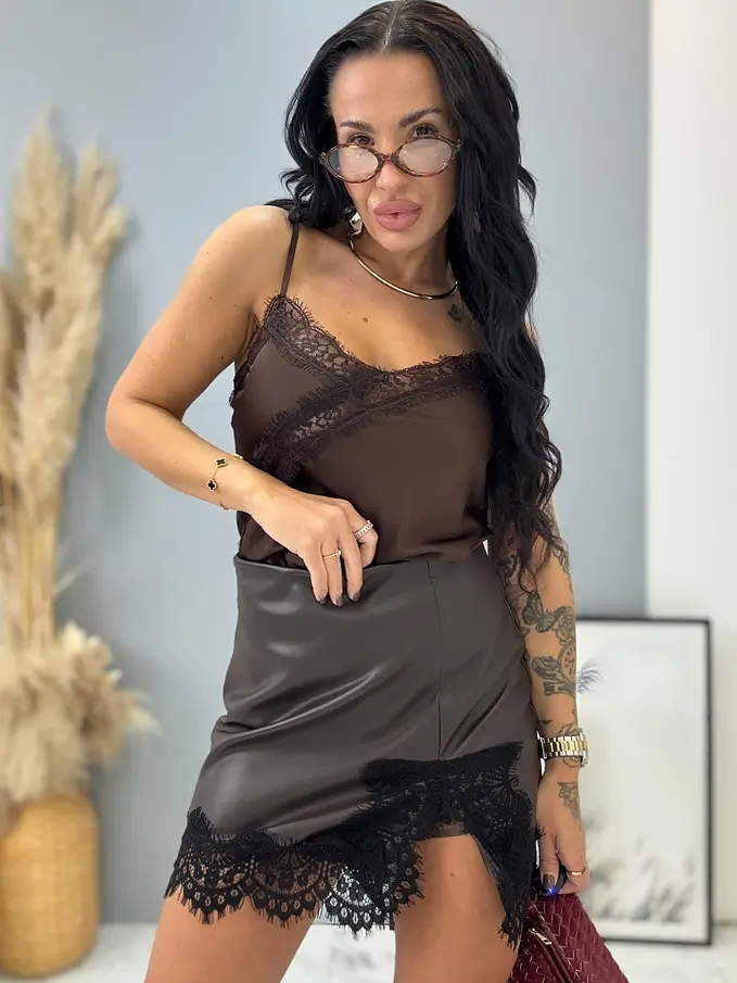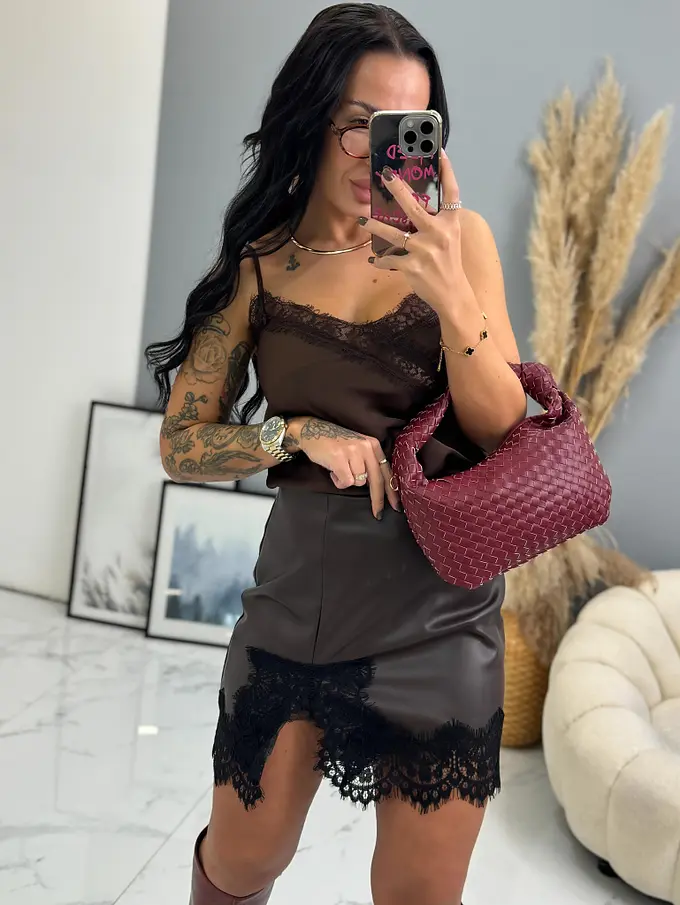 Hnedá koženková sukňa s čipkou ARTEMIS