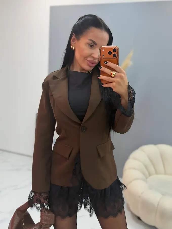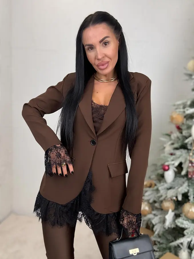 Dámske sako z príjemného materiálu. Materiál nie je elastický. Sako sa zapína na gombík. Má vypchávky v oblasti ramien. Priehľadnými čipkovými vsadkami.