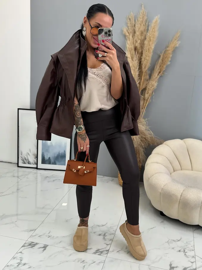 Hnedé koženkové legíny s vysokým pásom+