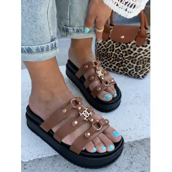 Dámske šľapky na každú príležitosť. Doplnky majú zlatú farbu.