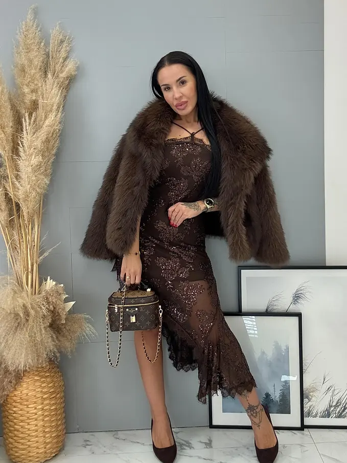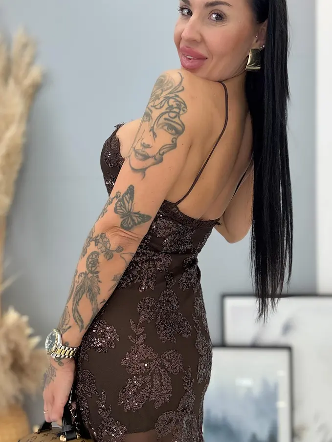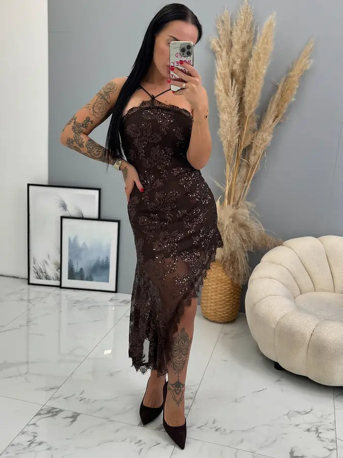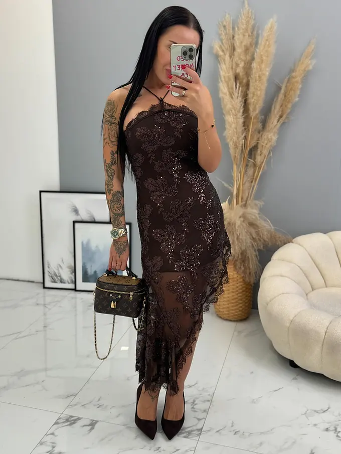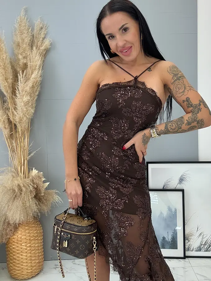Hnedé šifónové šaty zdobené flitrami AUDRIE