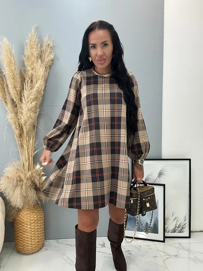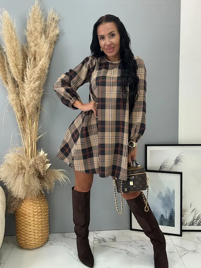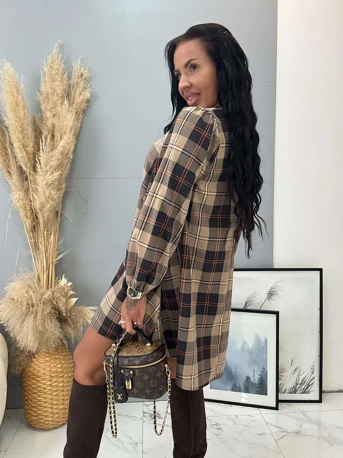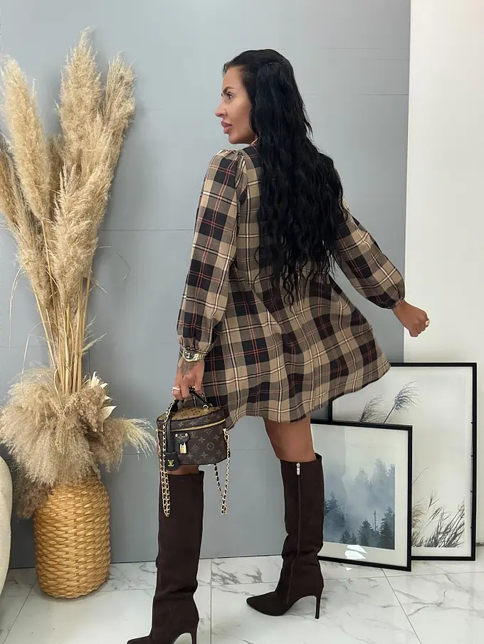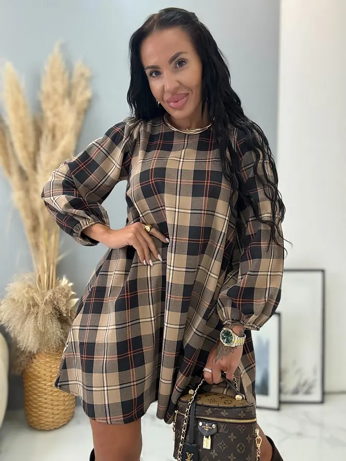 Kárované šaty, ktoré sa zapínajú vzadu pri krku na gombík a rukávy majú elastické manžety.