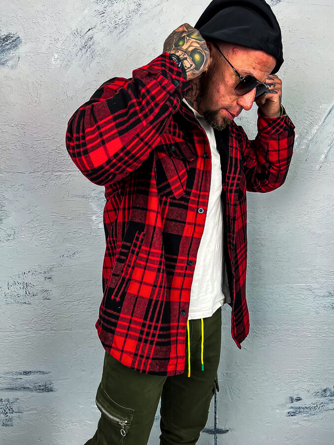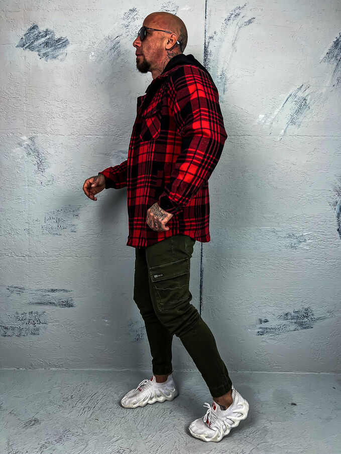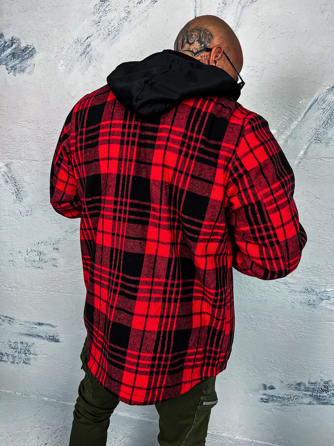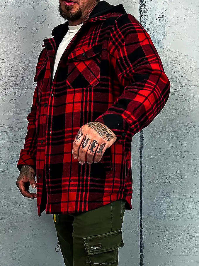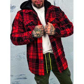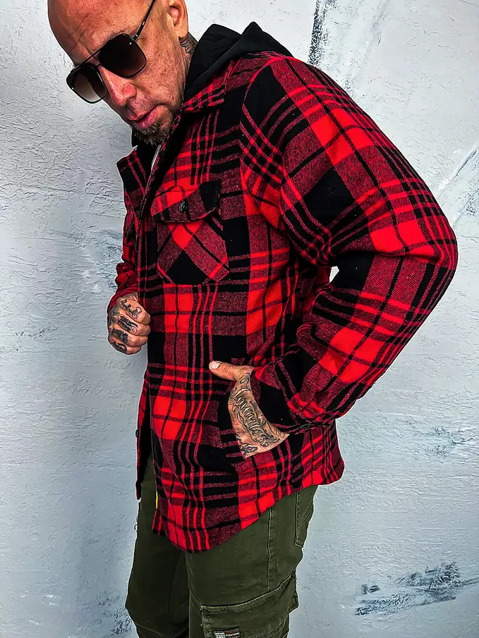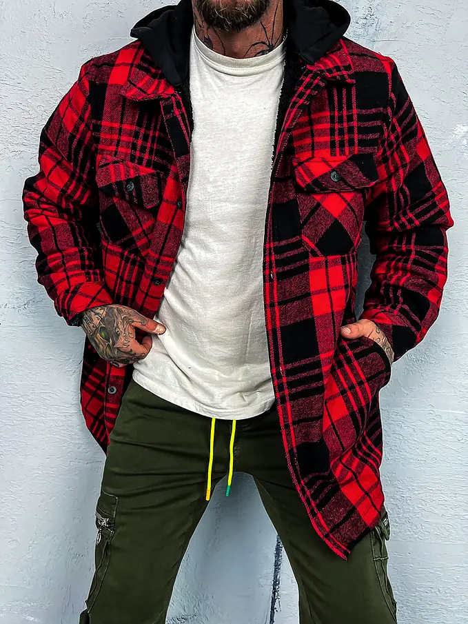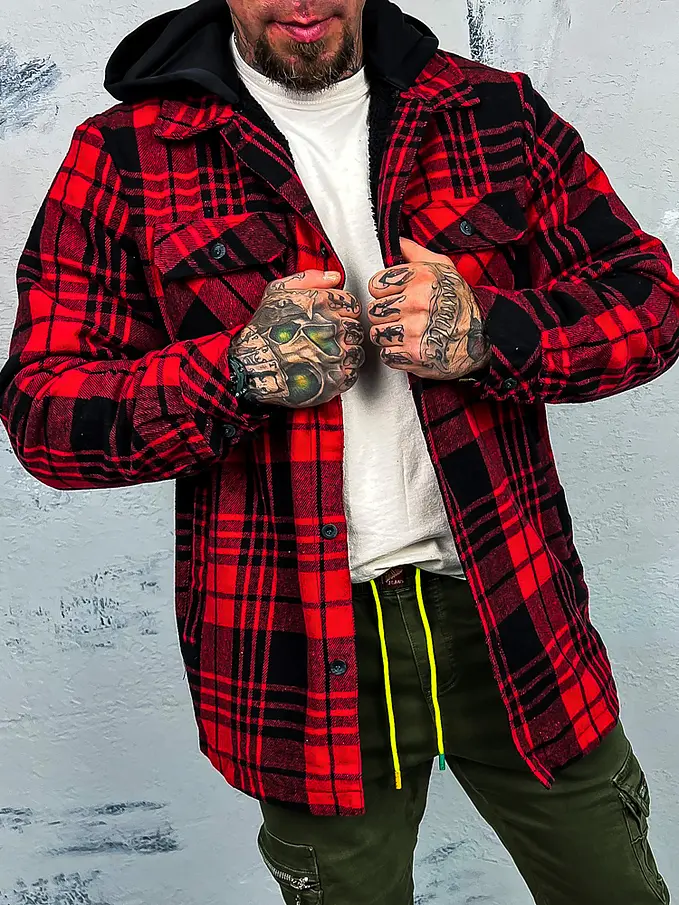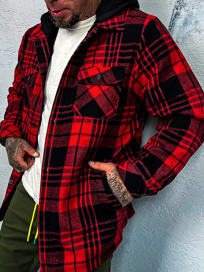 Pánska kockovaná vrchná košeľa s kapucňou. Je teplá. Kapucňa je odnímateľná.
