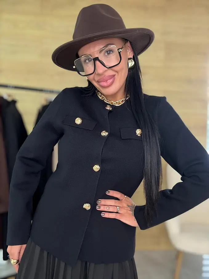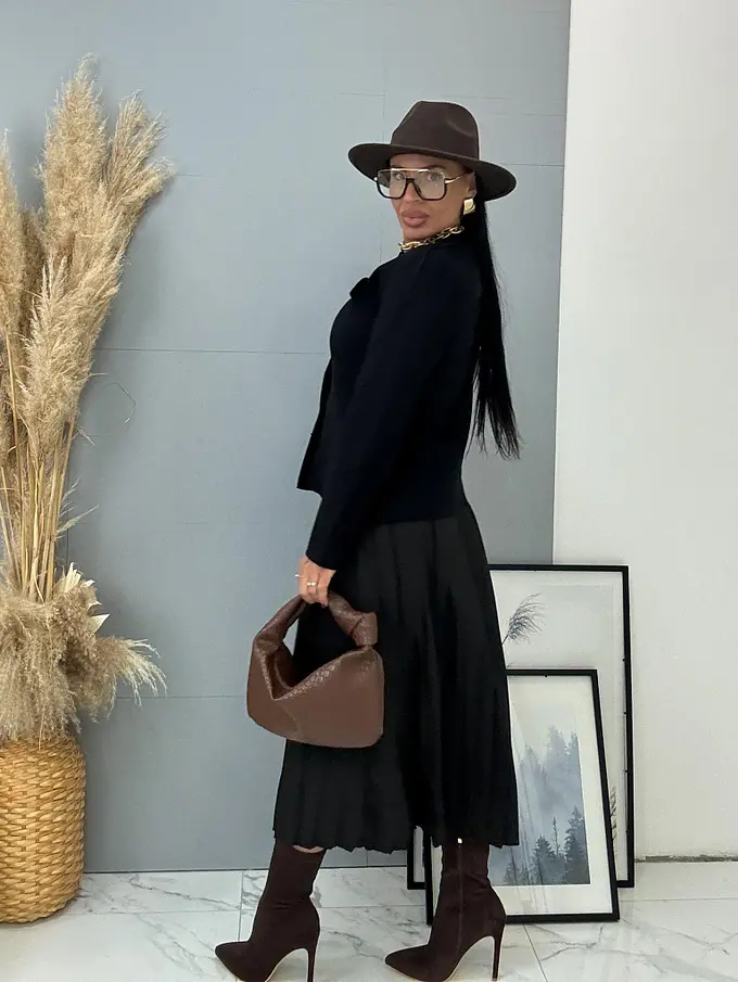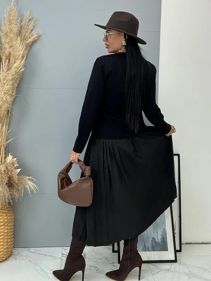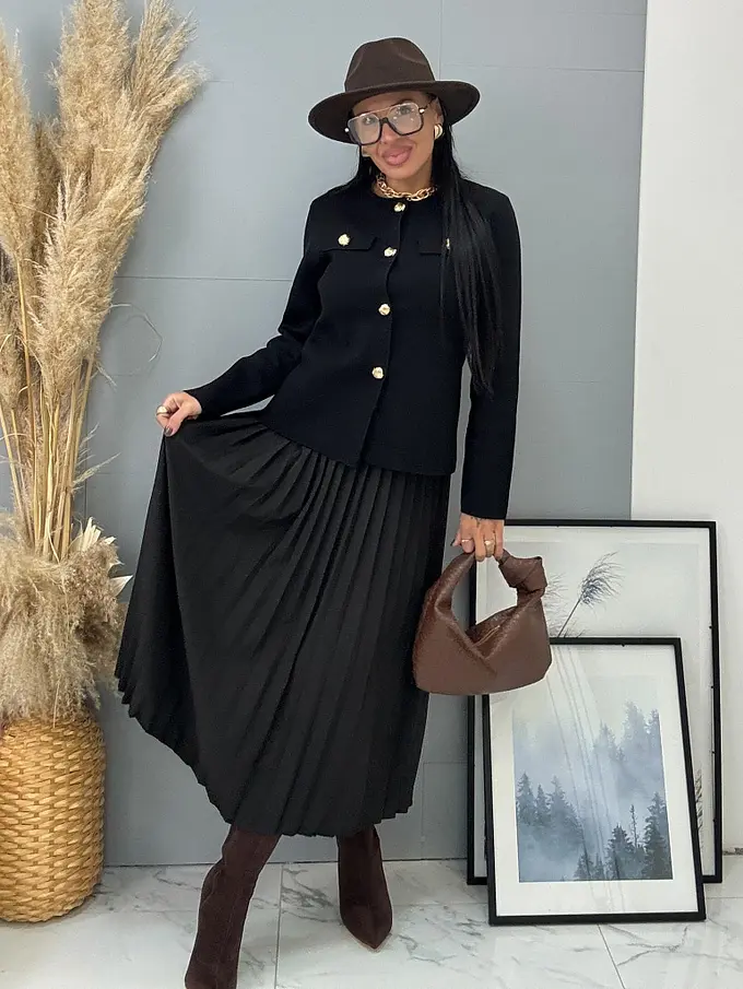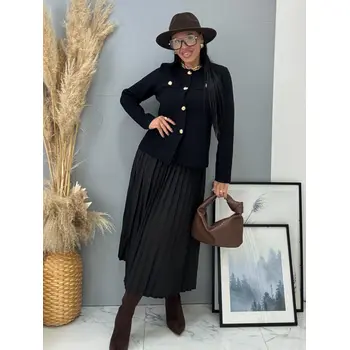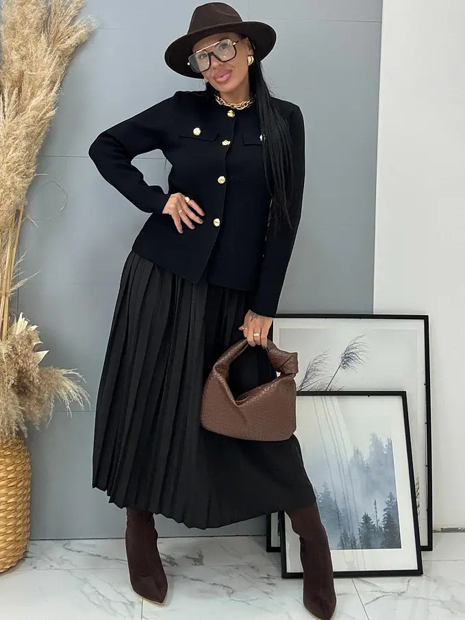 Komplet sa skladá zo šiat na ramienka a kardigánu. Materiál je príjemne elastický. Kardigán sa zapína na zlaté gombíky. Šaty doplnené opaskom.