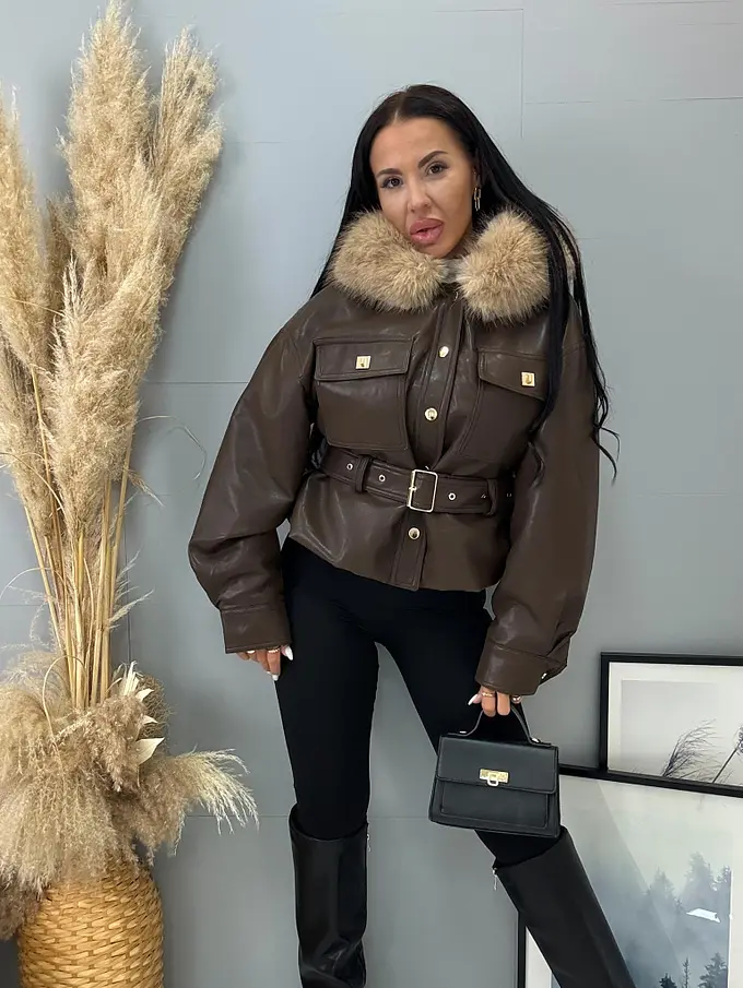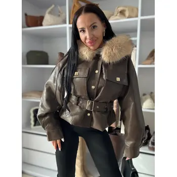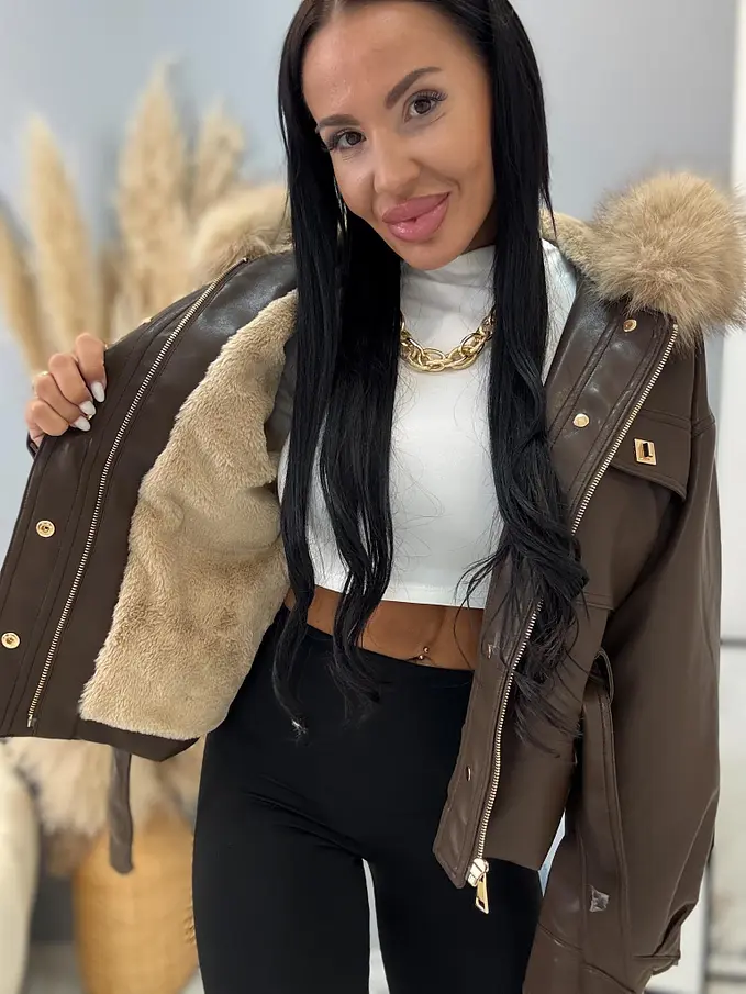 Kožená bunda s odnímateľným kožušinovým lemom na golieri. Podšitý mäkkým, príjemným kožúškom. Detaily sú v zlatej farbe. S vreckami v prednej časti. S opaskom.