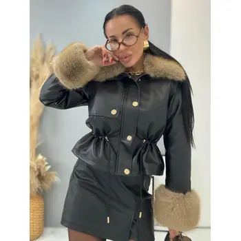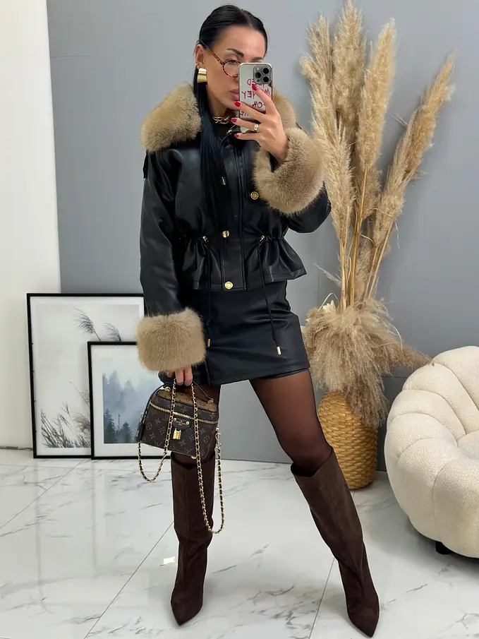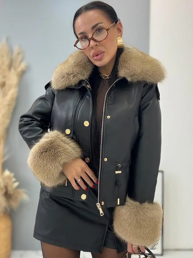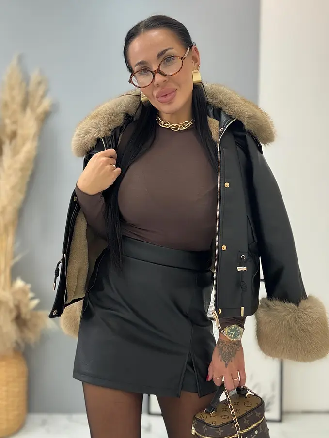 Kožená bunda s odnímateľným kožušinovým lemom na golieri a rukávoch. Podšitý mäkkým, príjemným kožúškom. Detaily sú v zlatej farbe. S bočnými vreckami.