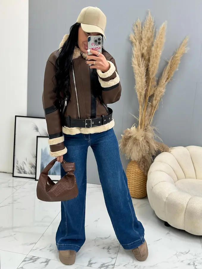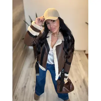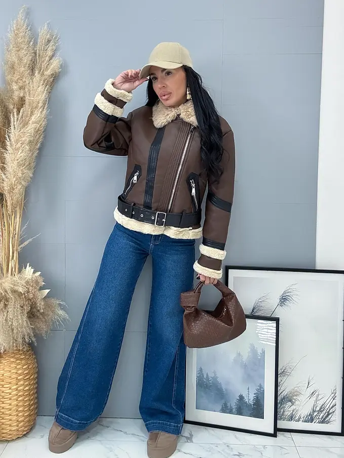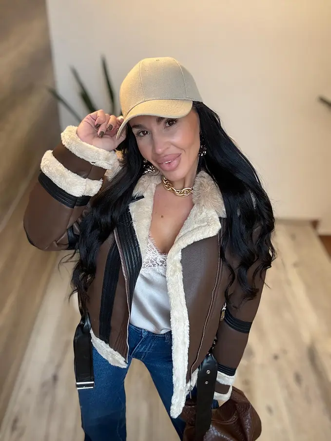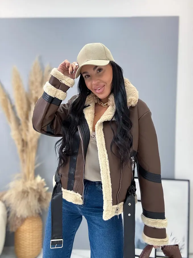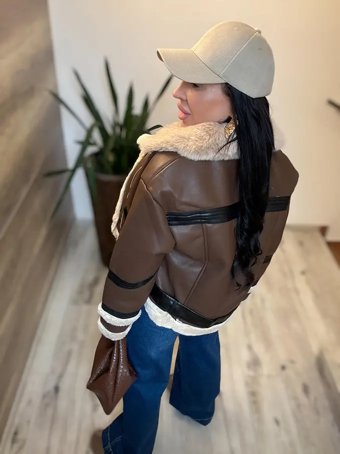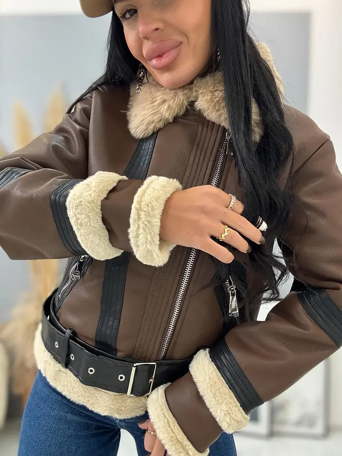 Kožená bunda s neodnímateľným kožušinovým lemom na golieri a rukávoch. Podšitý mäkkým, príjemným kožúškom. Detaily sú v stribornej farbe. S bočnými vreckami.