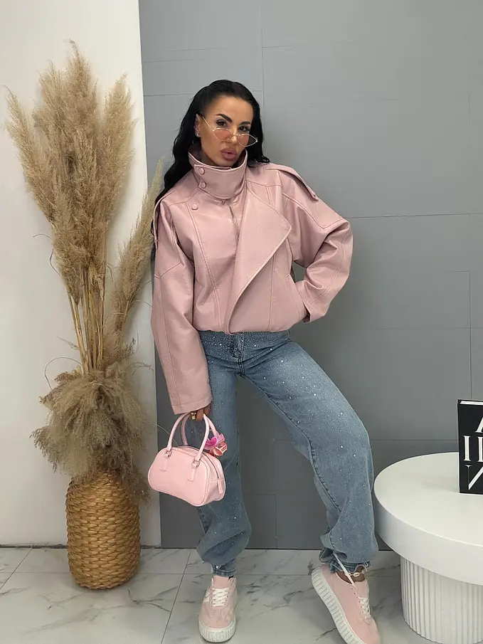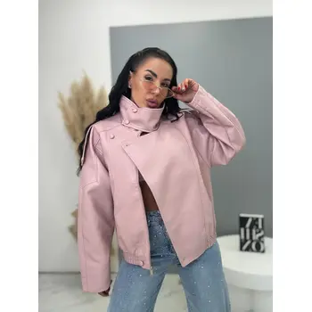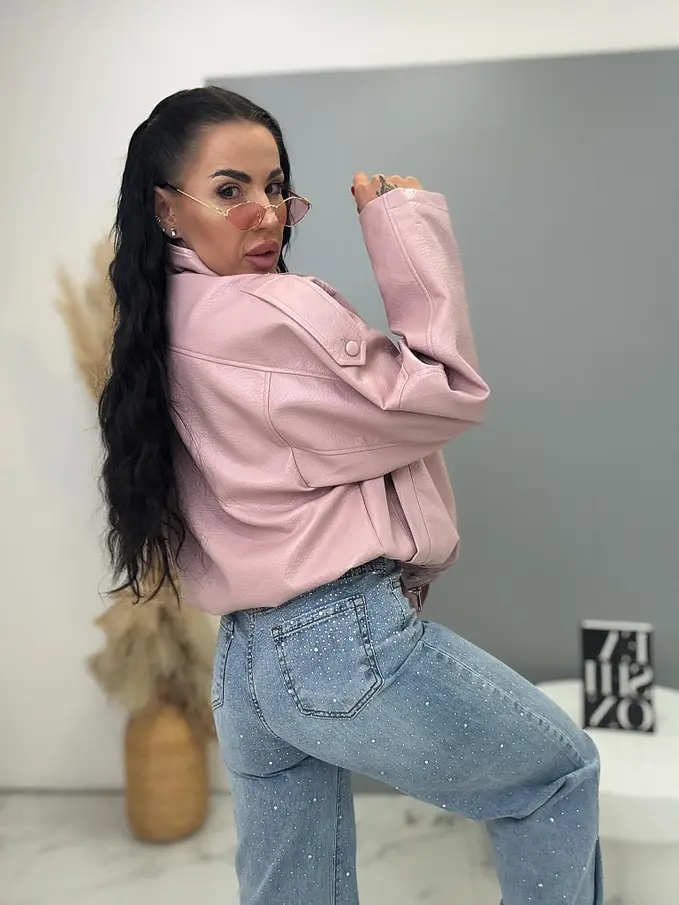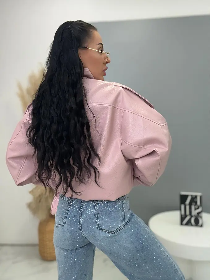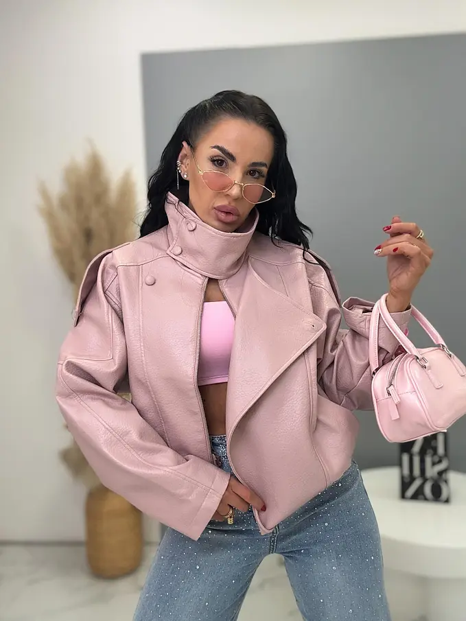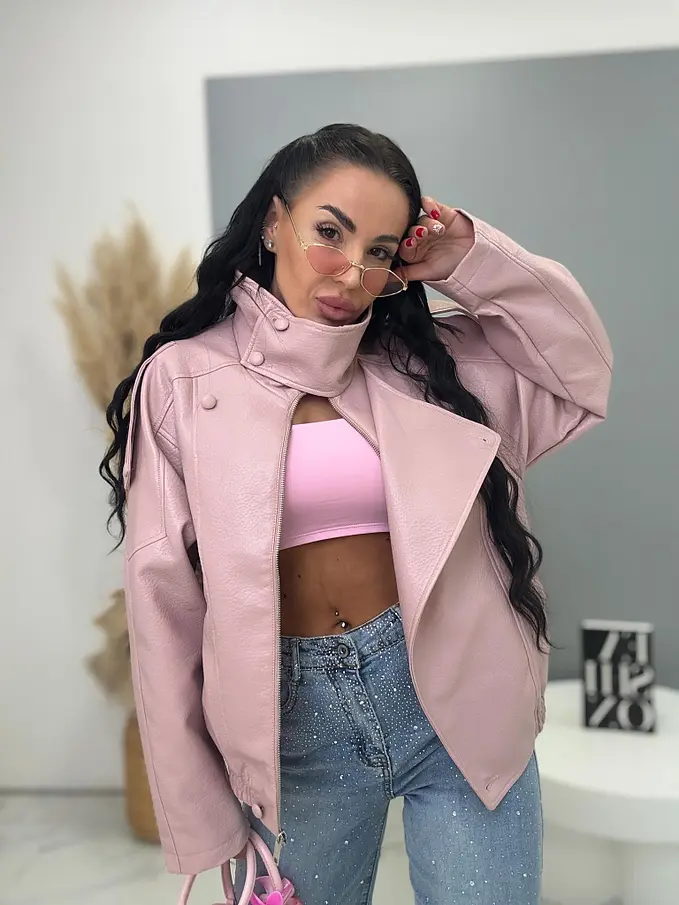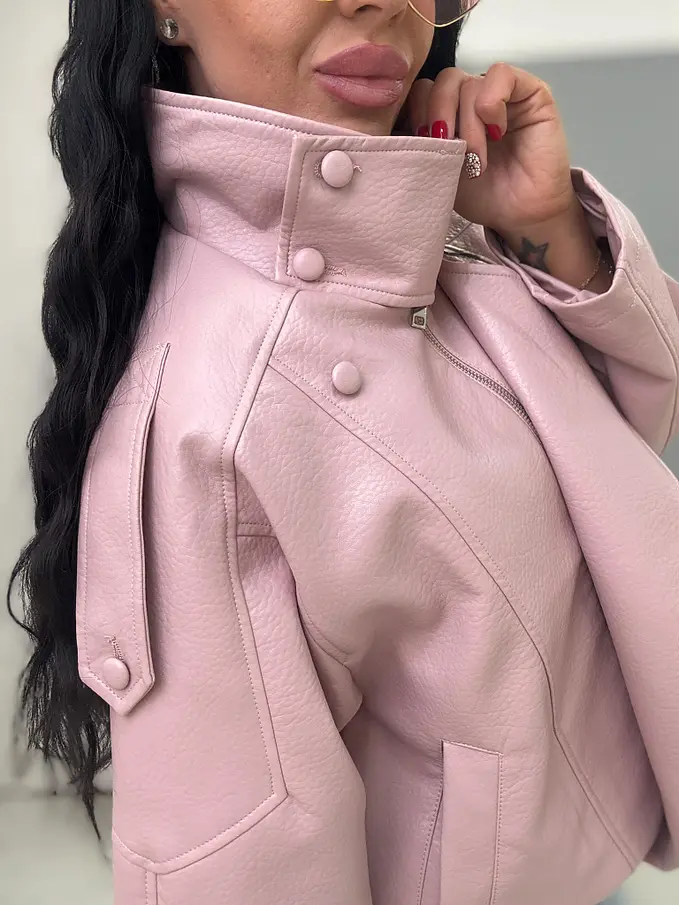 Kožená bunda s golierom a bomber strihom. Má praktické bočné vrecká a elastický lem. Zapína sa na gombíky a zlatý zips. Material nie je elastický, s podšívkou.