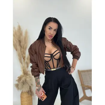 Krátka koženková bunda. Zips je zlatej farby. Spodnú časť bundy je možné natiahnúť.