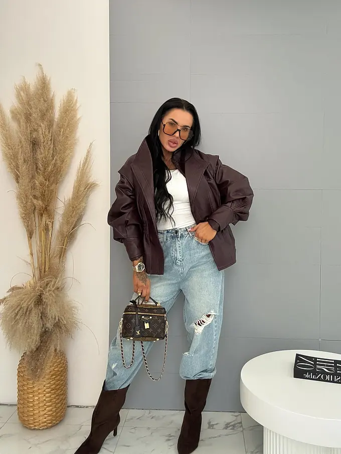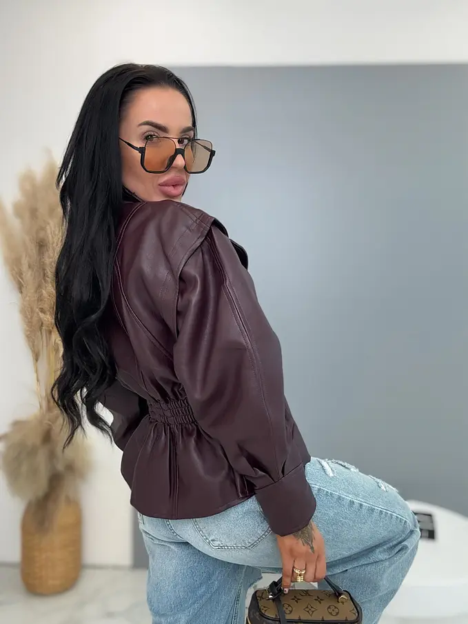 Krátka koženková bunda. Detaily sú v čiernej farbe a gumeným pásom.