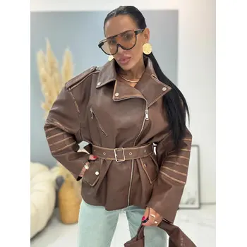 Krátka koženková bunda. Vpredu má funkčné vrecká. Detaily sú v stribornej farbe.