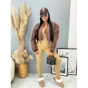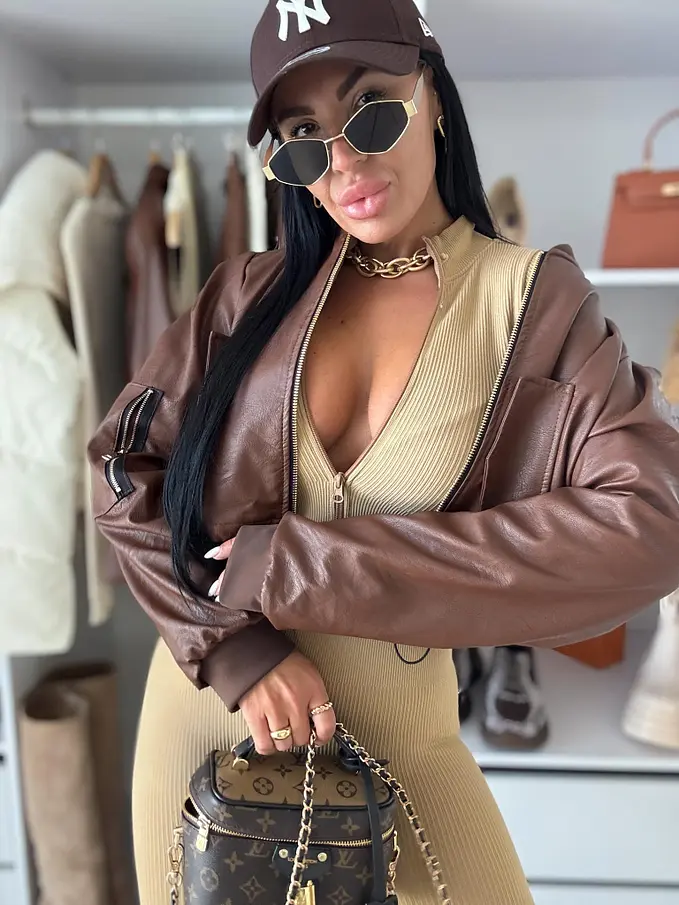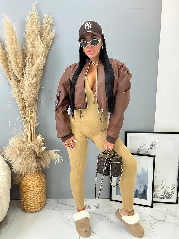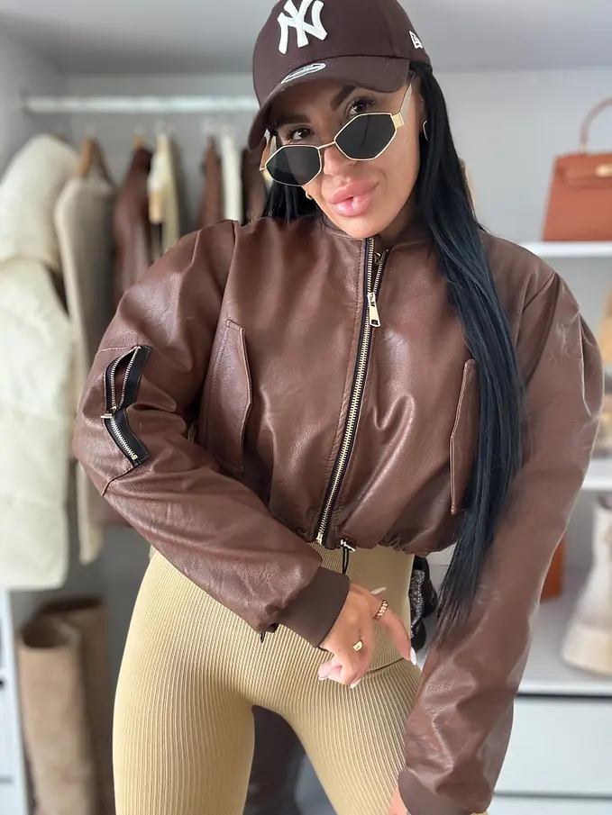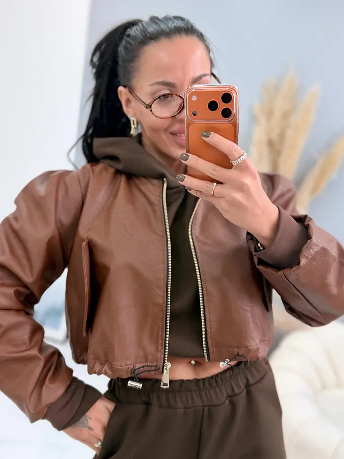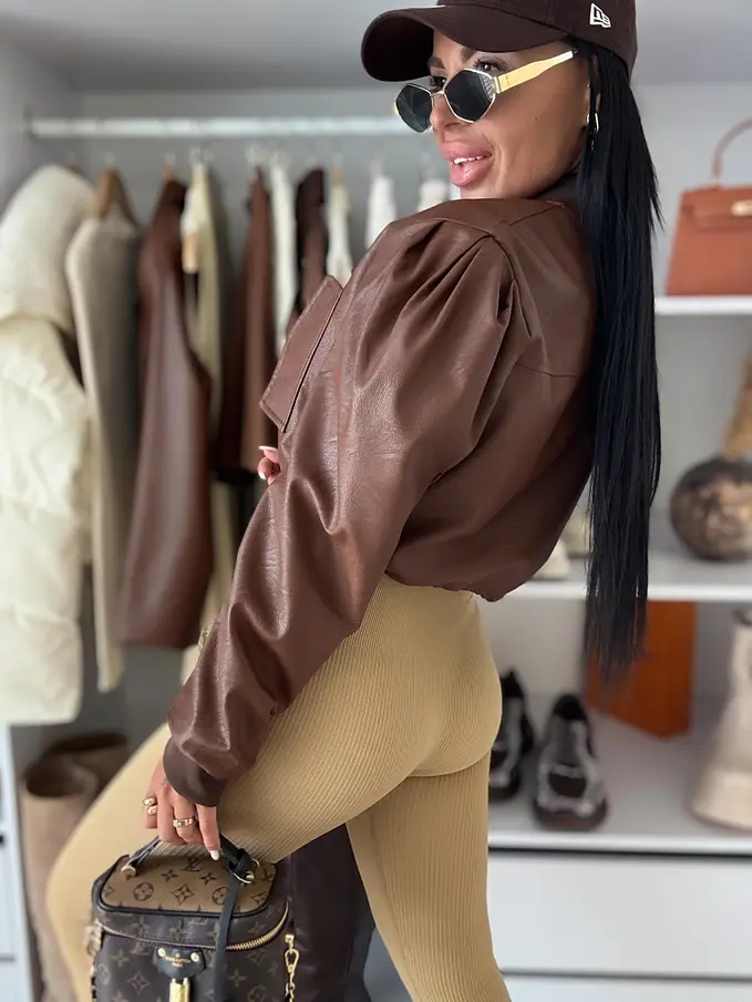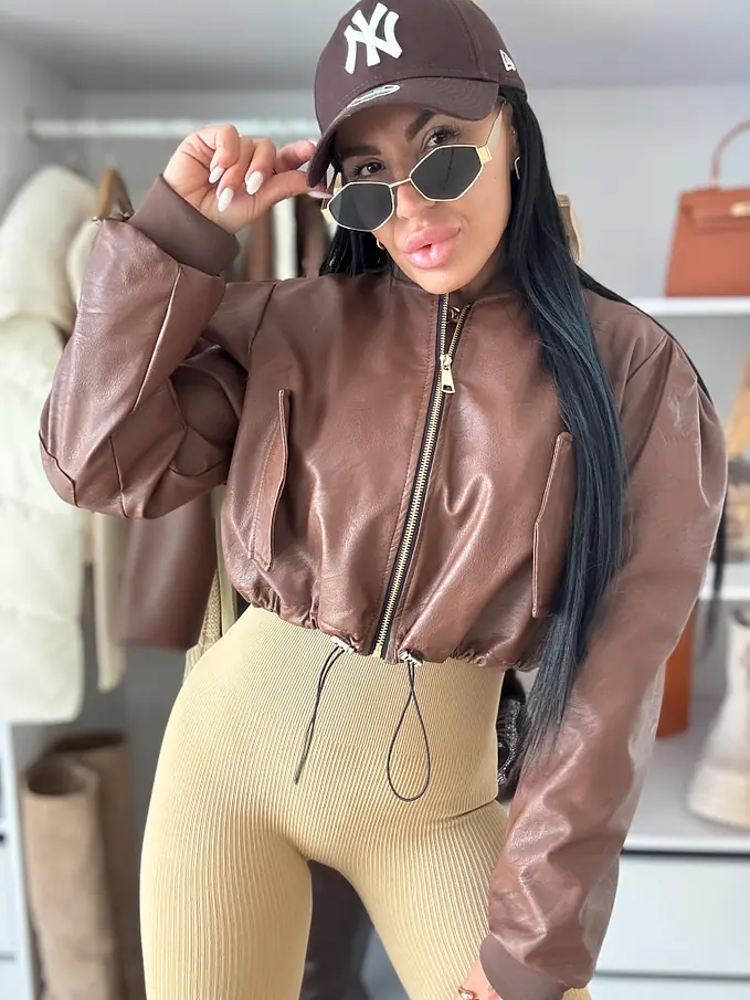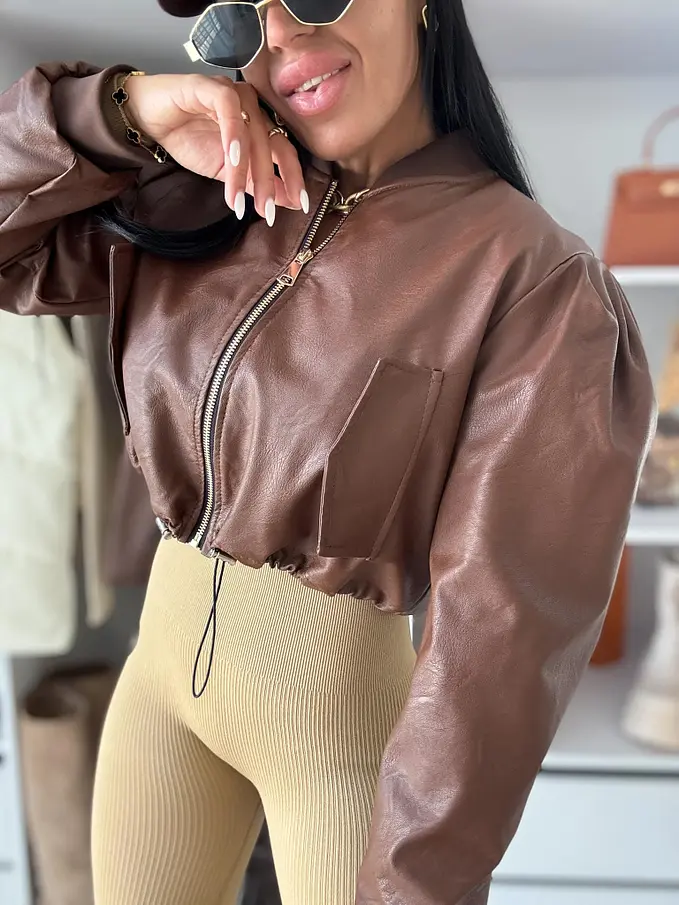 Krátka koženková bunda. Zips je zlatej farby. Spodnú časť bundy je možné natiahnúť.