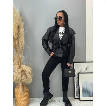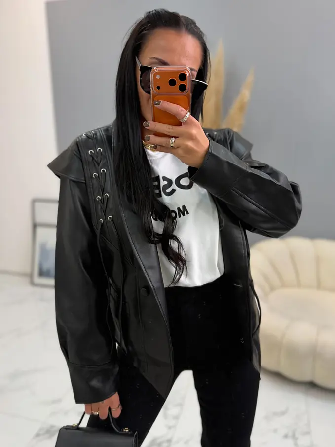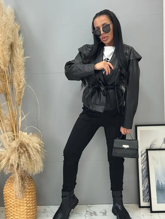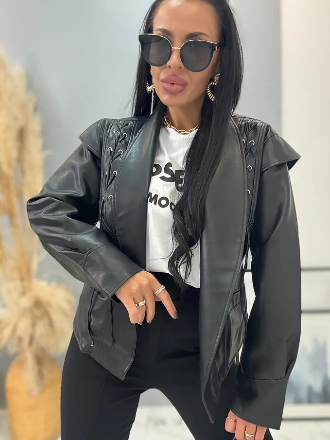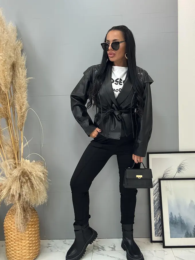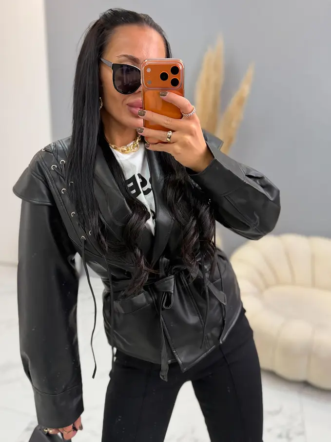 Krátka koženková bunda. Vpredu má funkčné vrecká. Zips je striebornej farby.