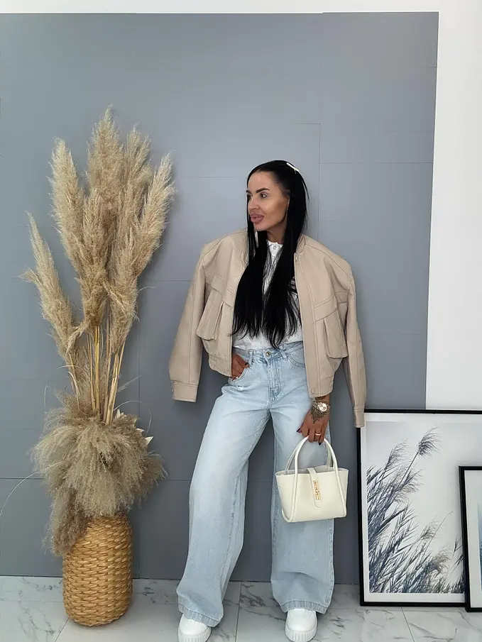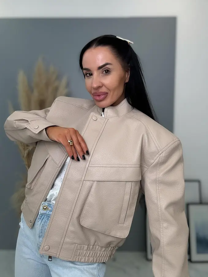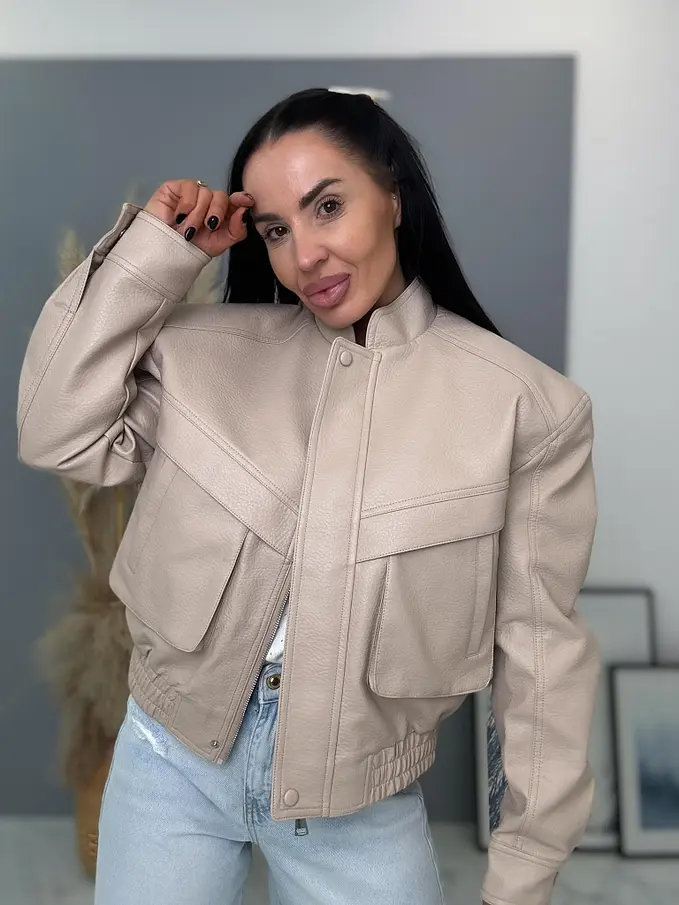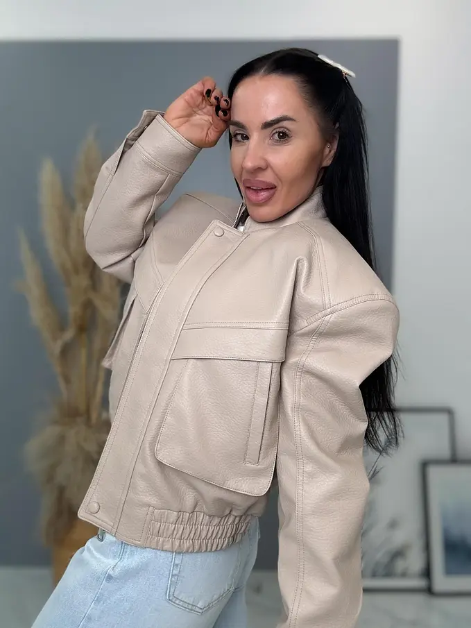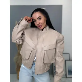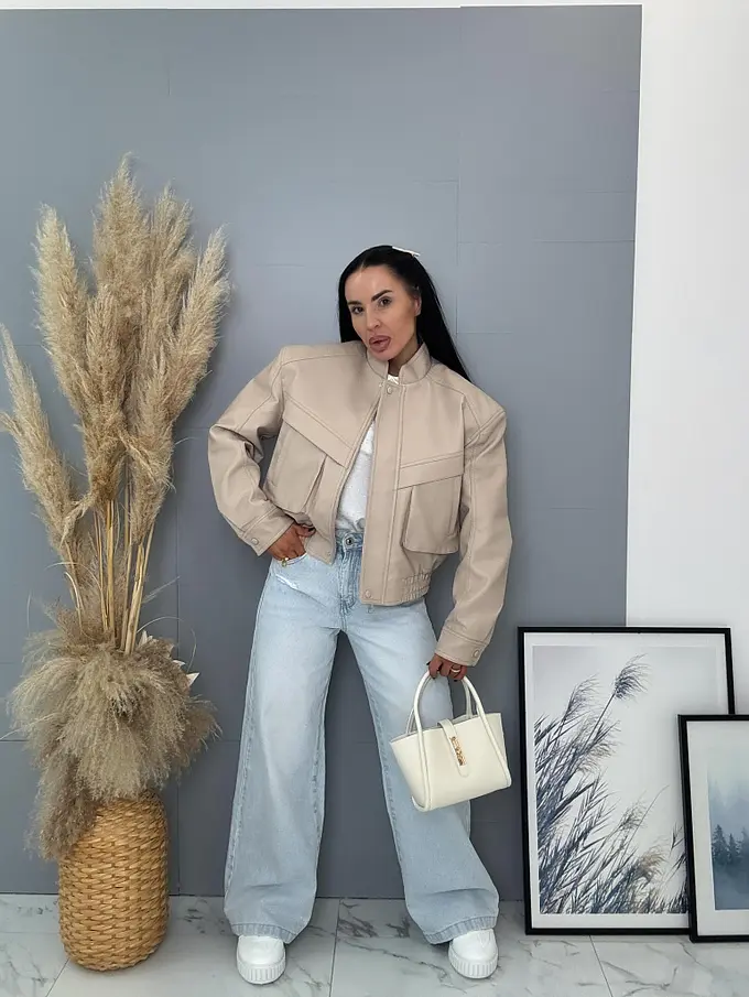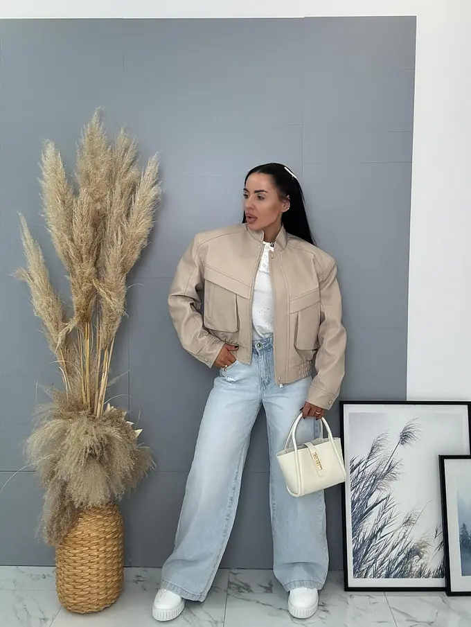 Krátka koženková bunda s vypchávkami. Detaily sú v striebornej farbe. Gumeným pásom a bočnými vreckami.