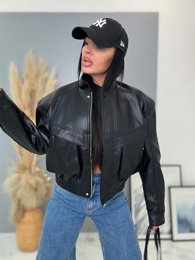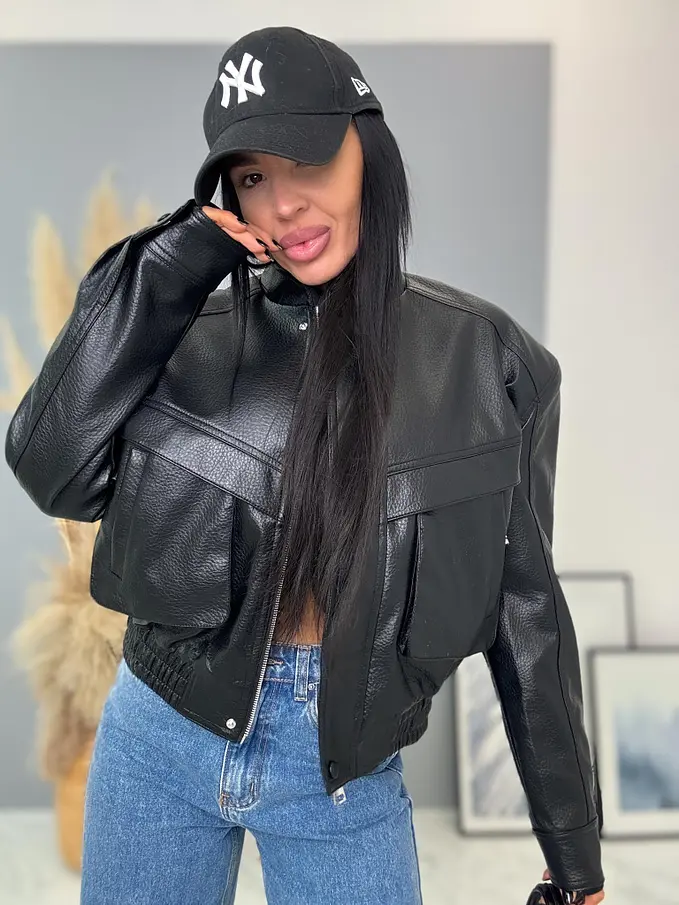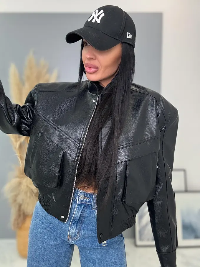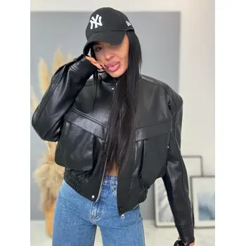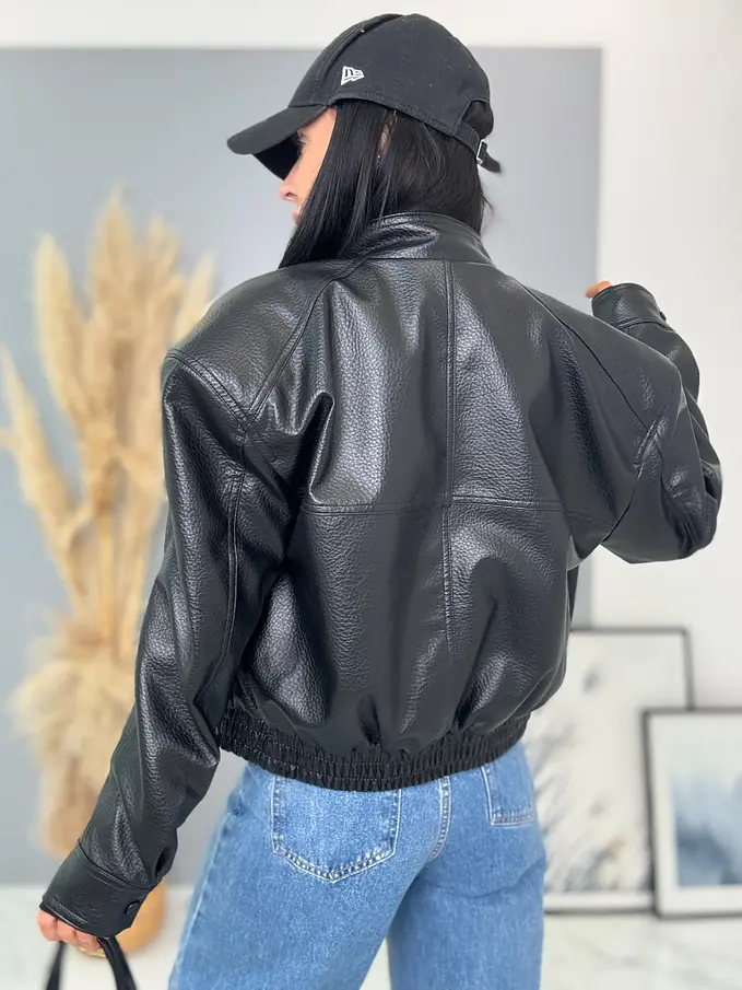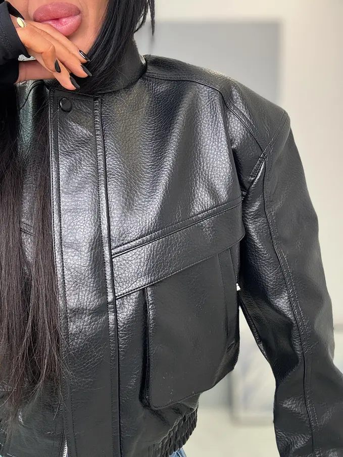 Krátka koženková bunda s vypchávkami. Detaily sú v striebornej farbe. Gumeným pásom a bočnými vreckami.
