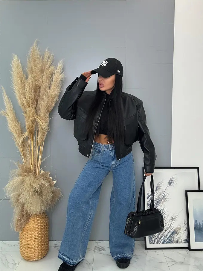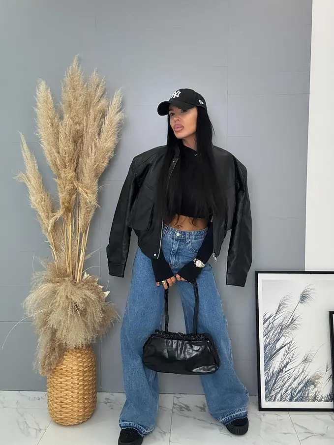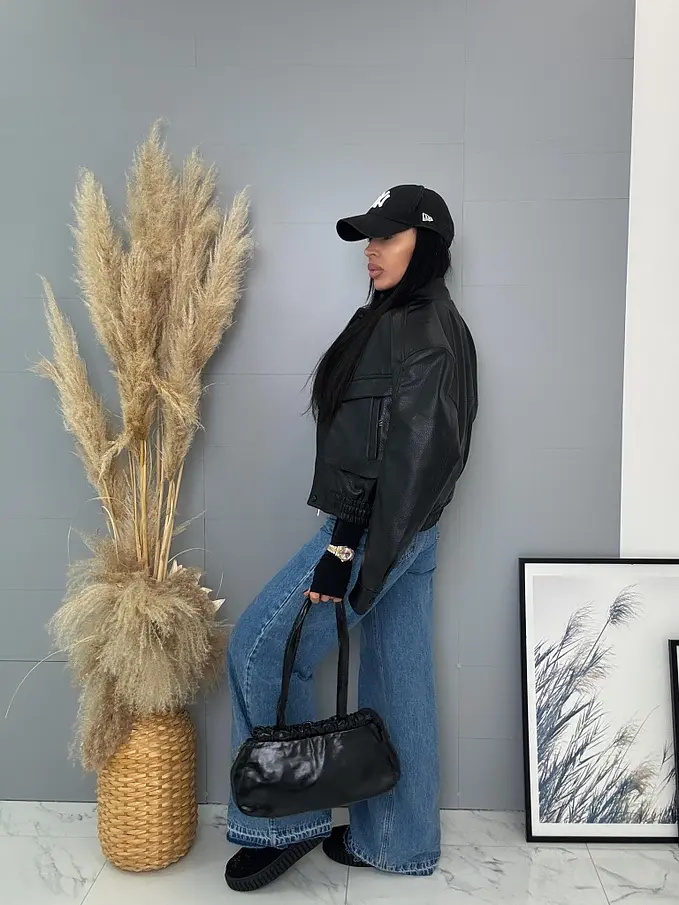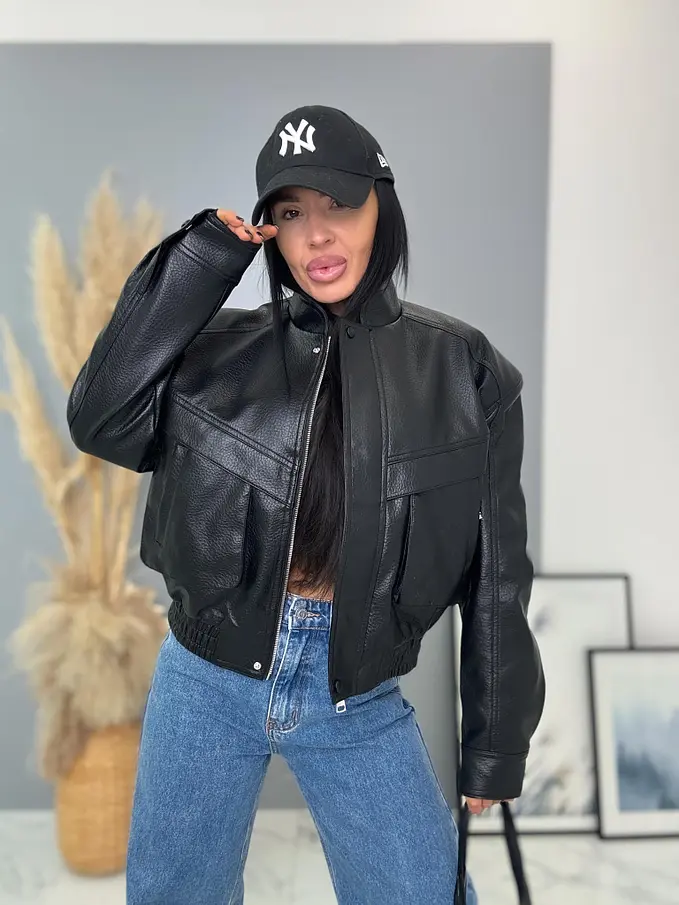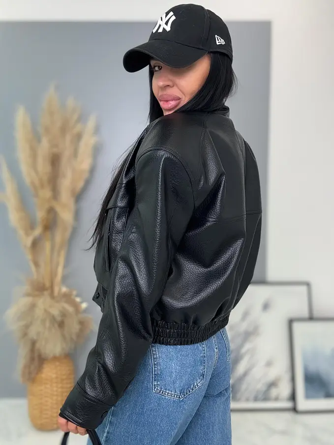 Krátka koženková bunda s vypchávkami. Detaily sú v striebornej farbe. Gumeným pásom a bočnými vreckami.