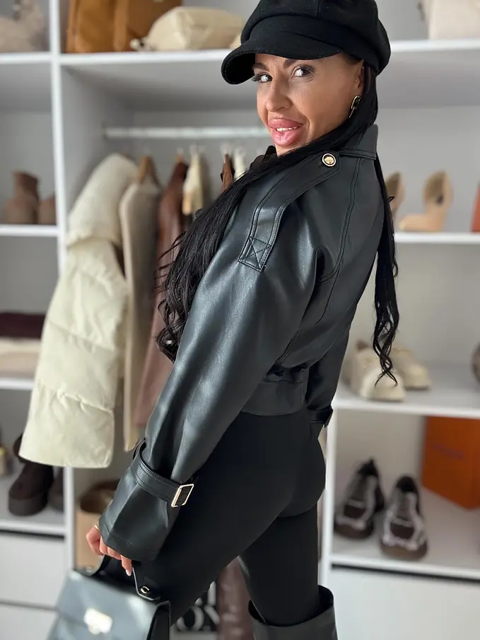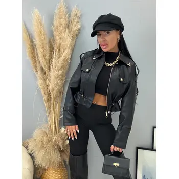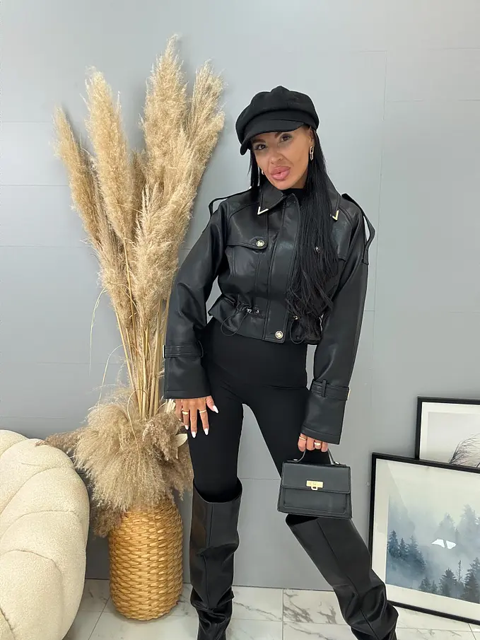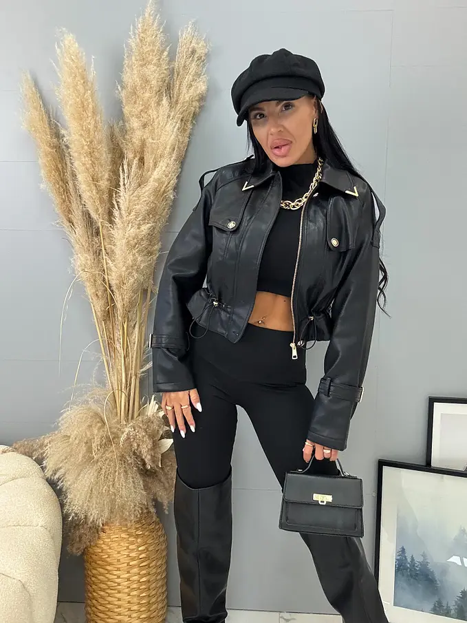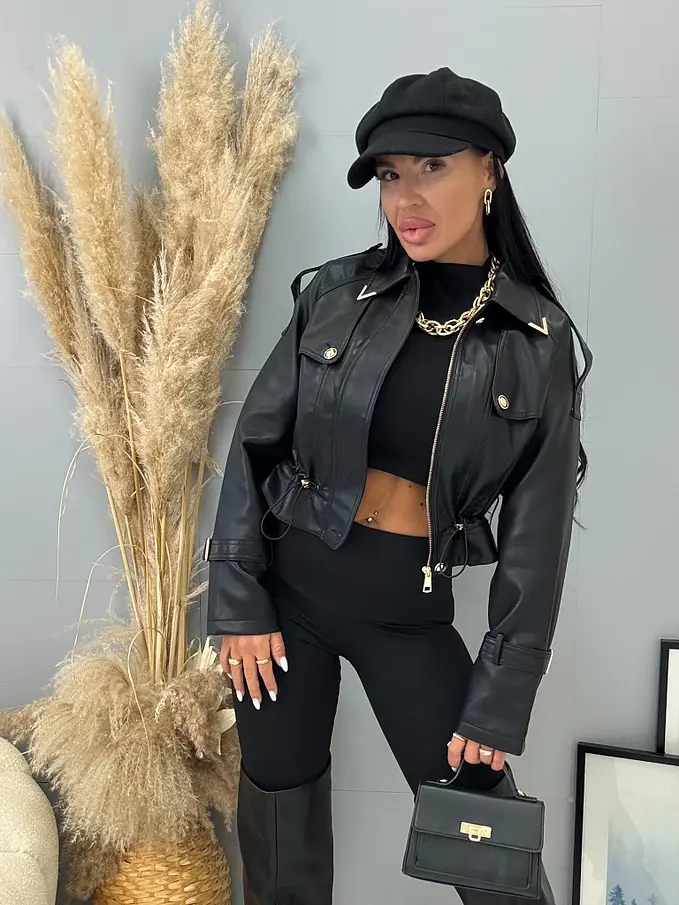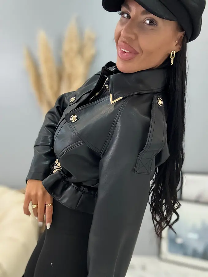 Krátka koženková bunda. Detaily sú v zlatej farbe.