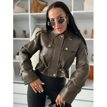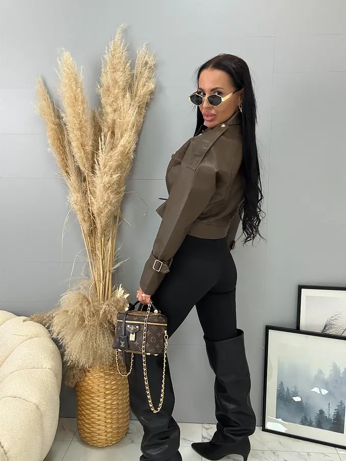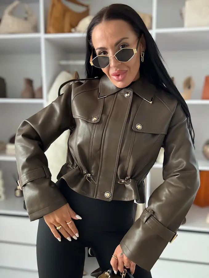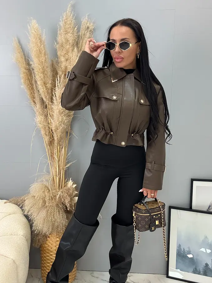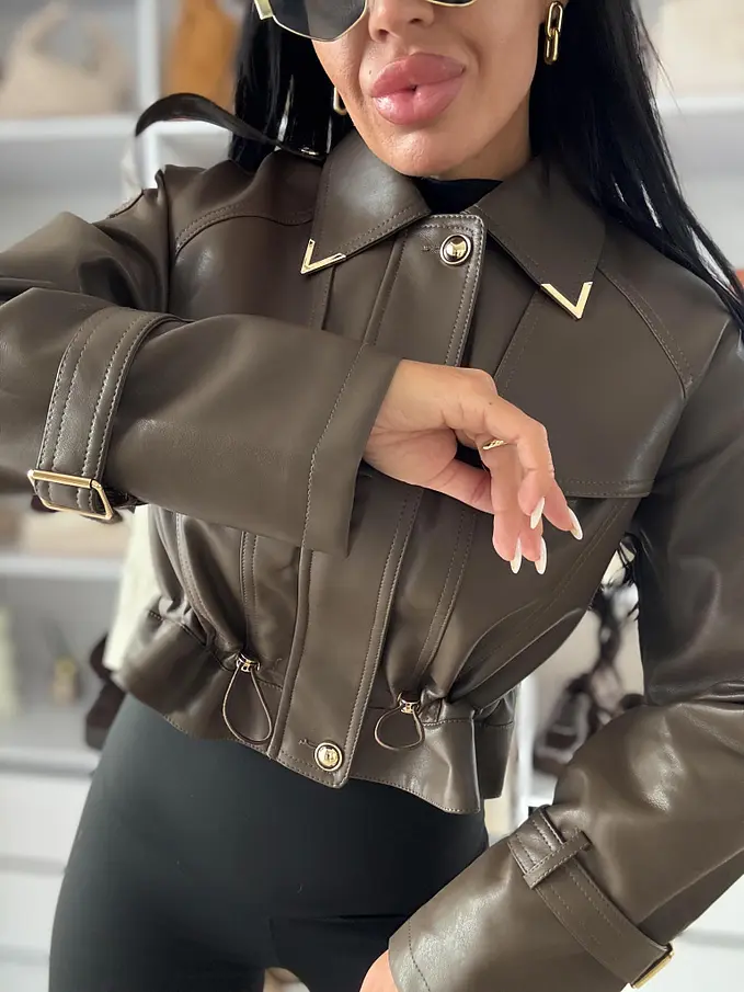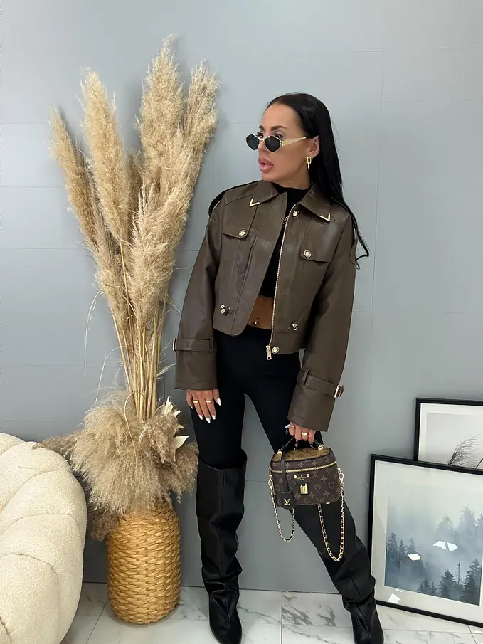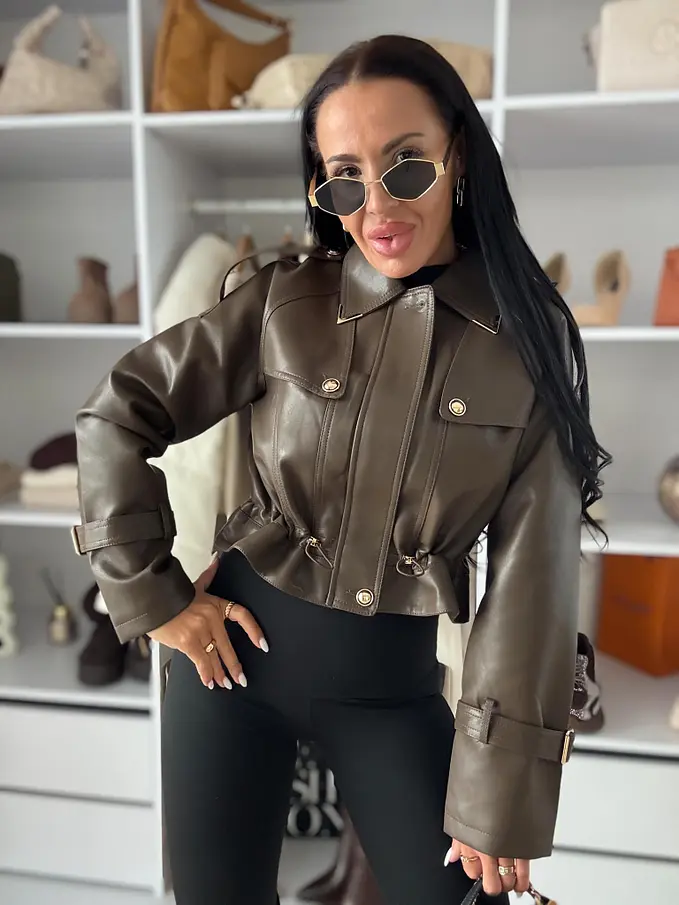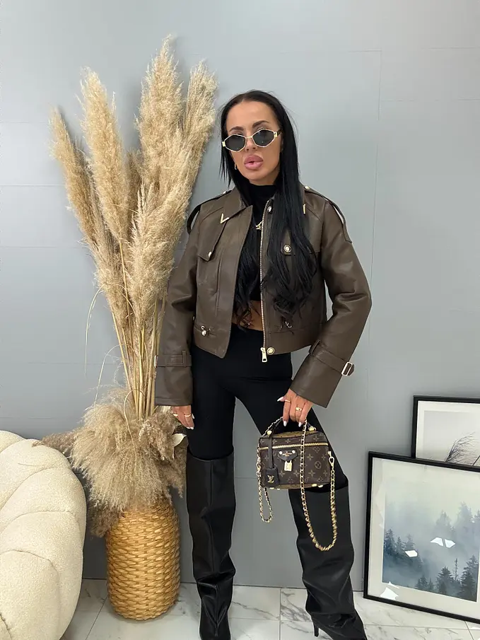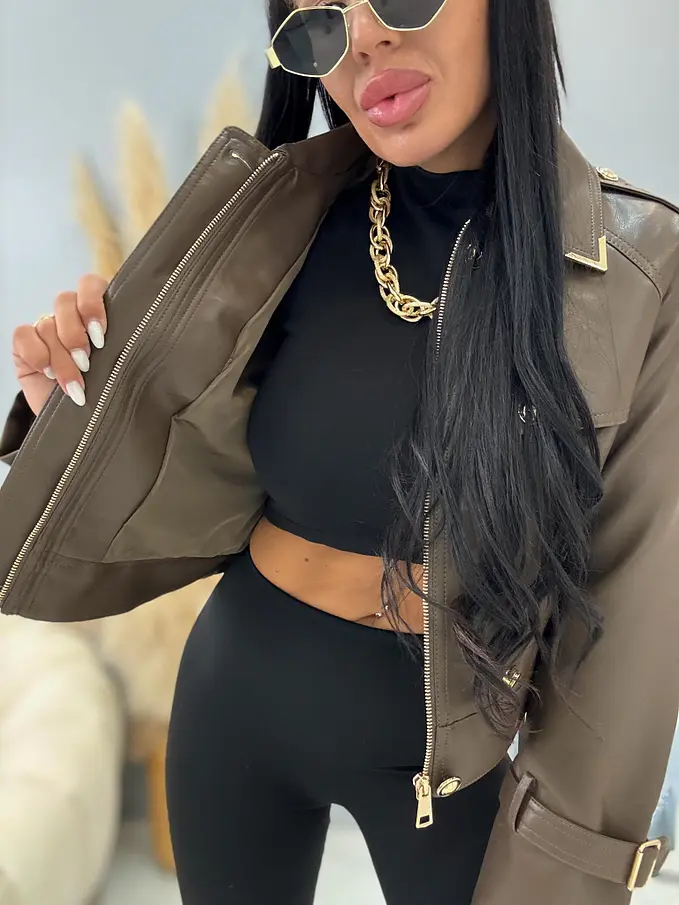 Krátka koženková bunda. Detaily sú v zlatej farbe.