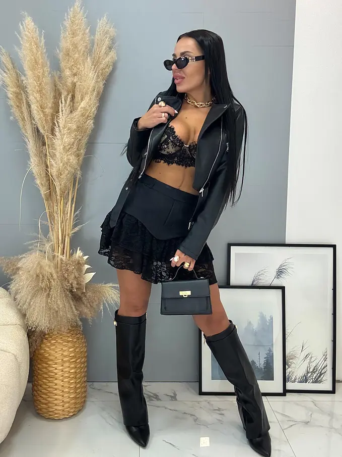 Modelka je 164 cm a váži 57 kg. Má na sebe veľkosť S