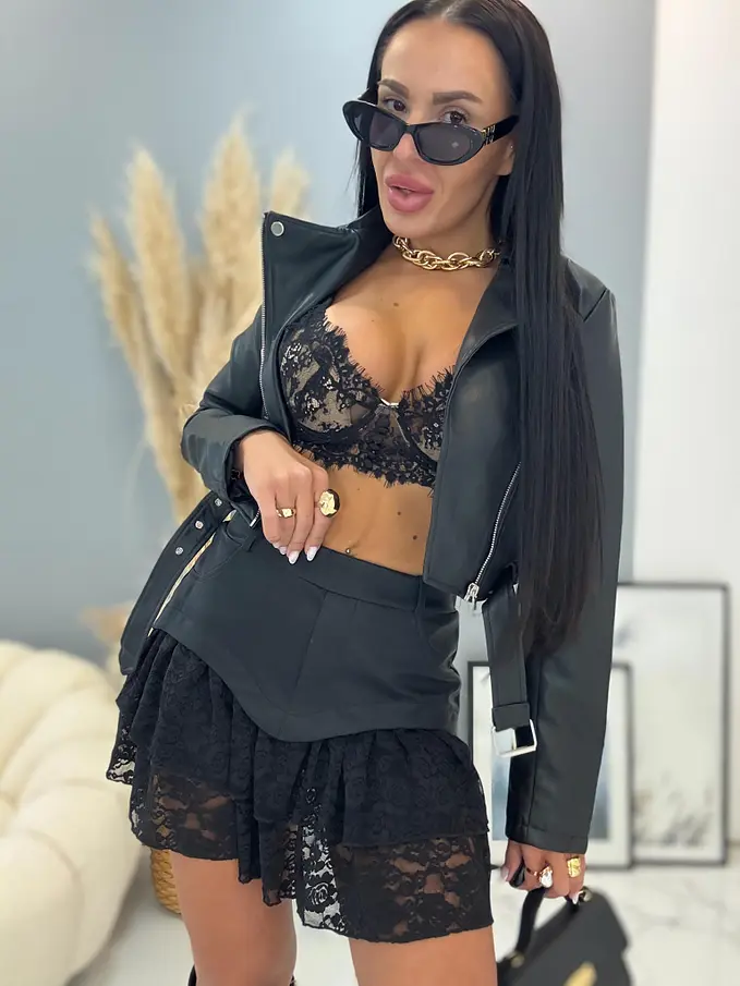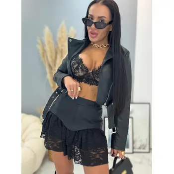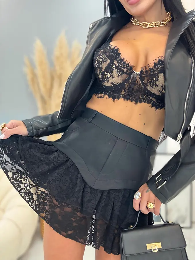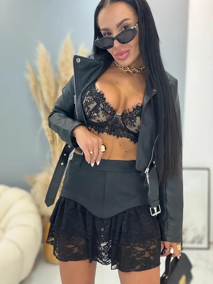 Volánová sukňa s gumeným pásom. S vnútornými šortkami. Volány sú z čipky.