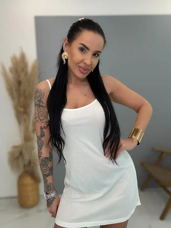 Modelka meria 164 cm a váži 57 kg. Má na sebe veľkosť S/M