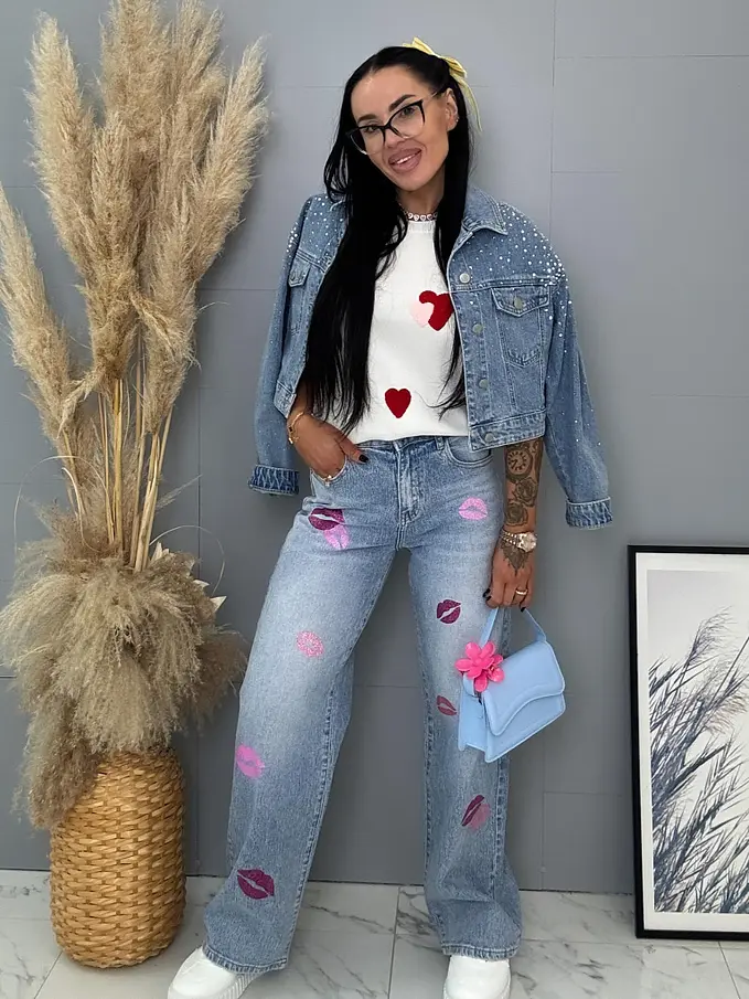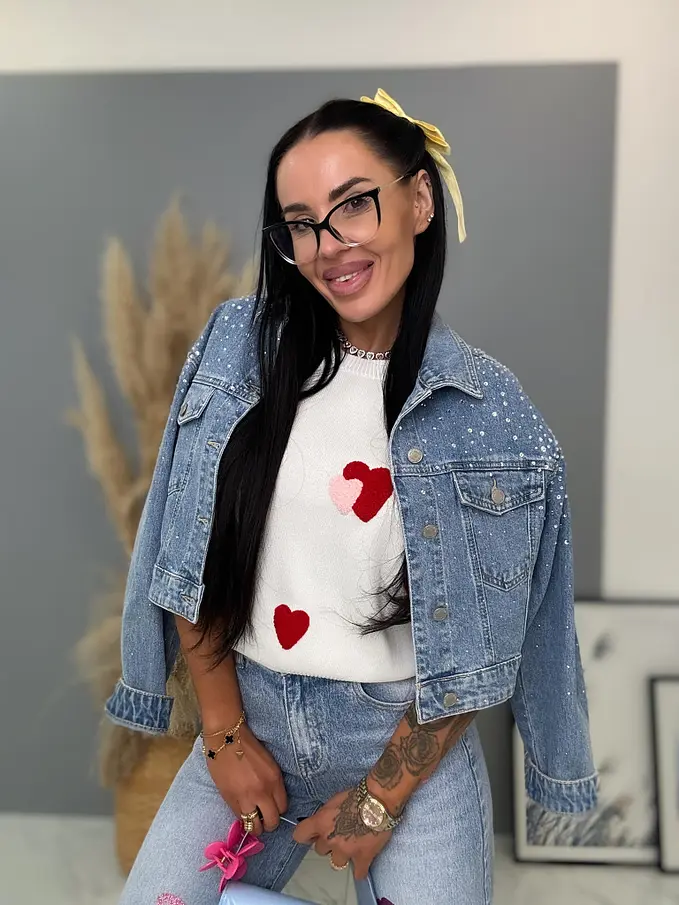 Dámsky denim kabát s ozdobnými kamienkami. Materiál je príjemný, ale nie je elastický. Gombíky majú striebornú farbu.