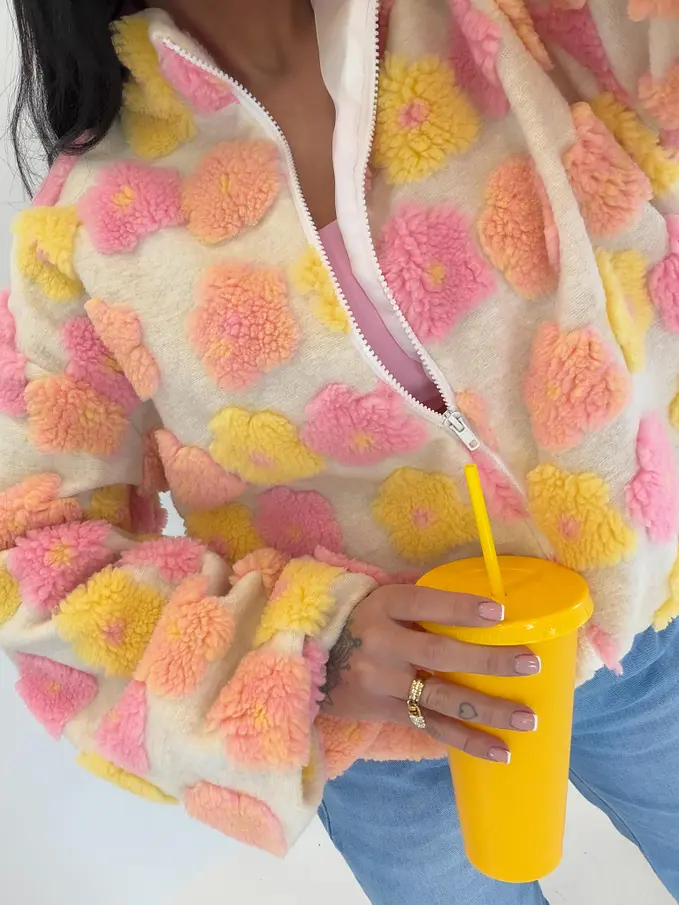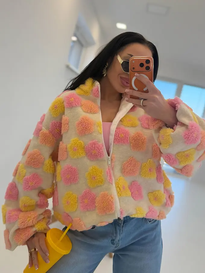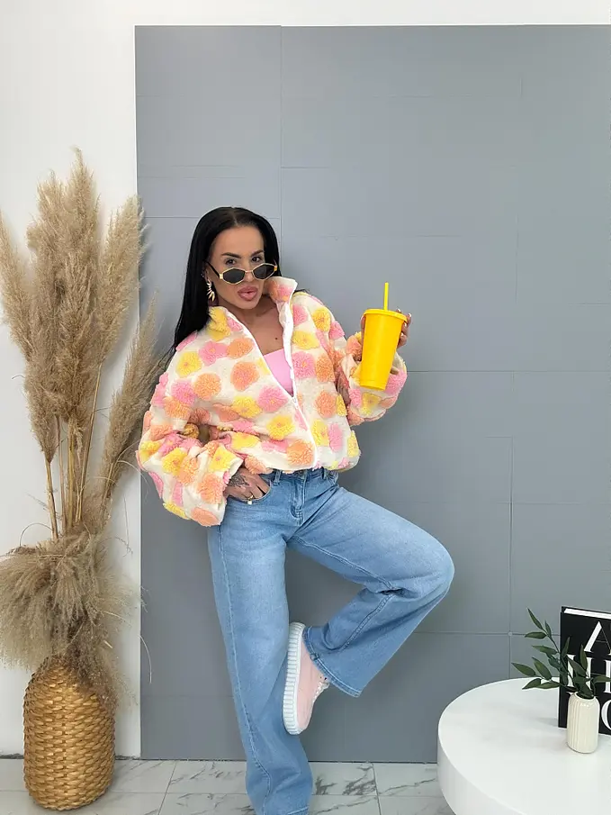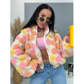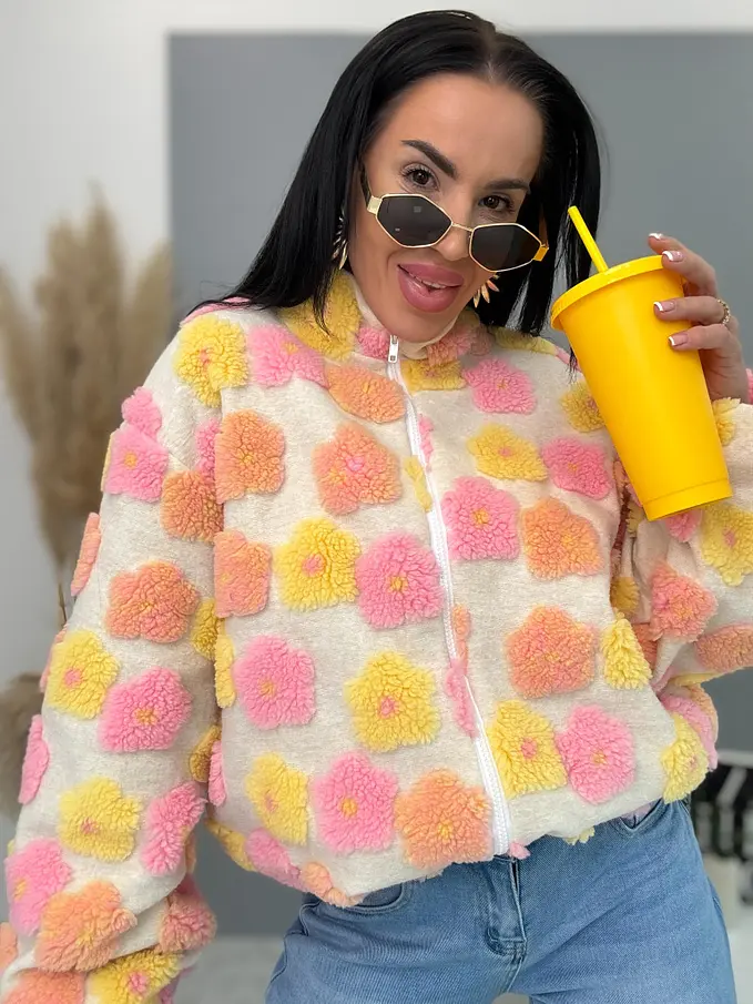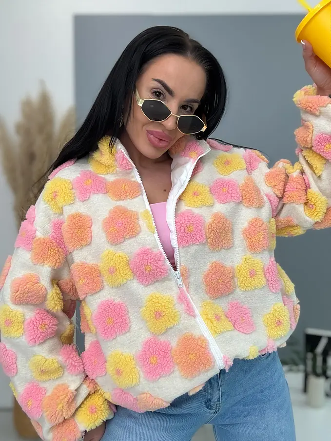 Kabát je vyrobený z príjemného materiálu. Model vyniká plyšovými aplikáciami v tvare kvetu. Oversize prevedenie so stojačikom a podšívkou. Zapína sa na zips. Bočnými vreckami.