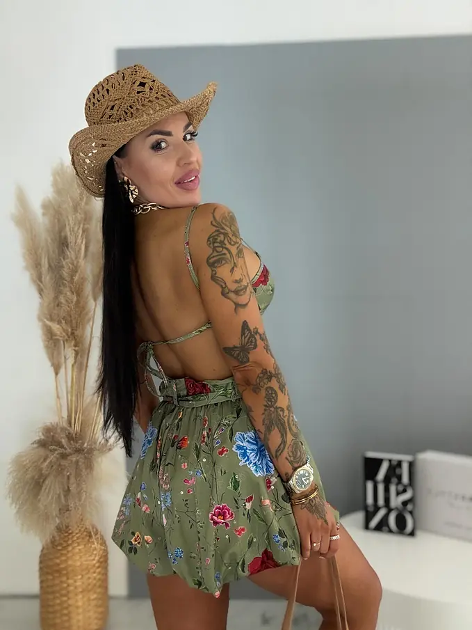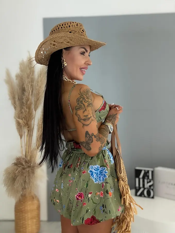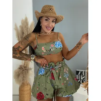 Kvetinový dvojdielny komplet z novej kolekcie priamo z Talianska. Pozostáva z crop topu a cibuľových šortiek. Materiál je príjemný, ale nie je elastický. Crop top sa viaže na zadnej strane. Ramienka sú nastaviteľné. Cibuľové šortky majú opasok a elastický pás so zapínaním na zips vpredu. Majú aj bočné vrecká.