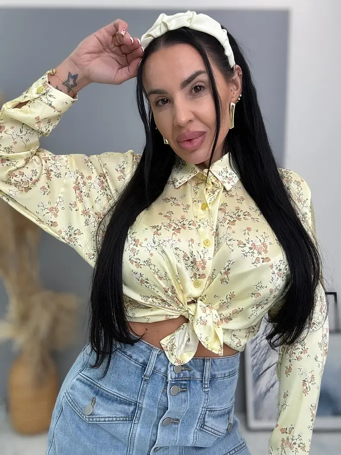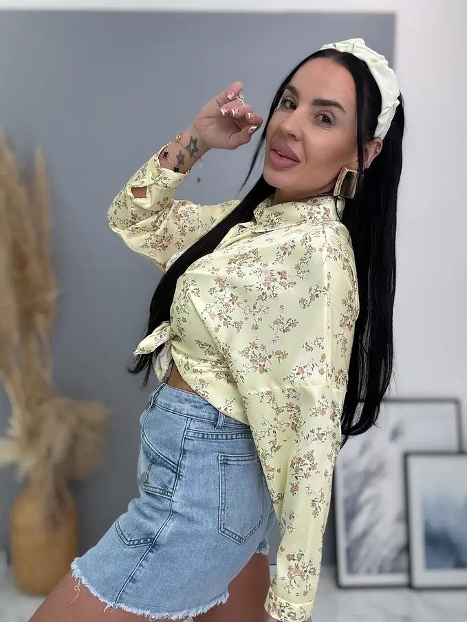 Táto ženská a hravá blúzka je ideálna na jarné a letné outfity. Gombíky majú žltú farbu. Material ľahký a pohodlný, ideálny na celodenné nosenie. Viazanie v páse.