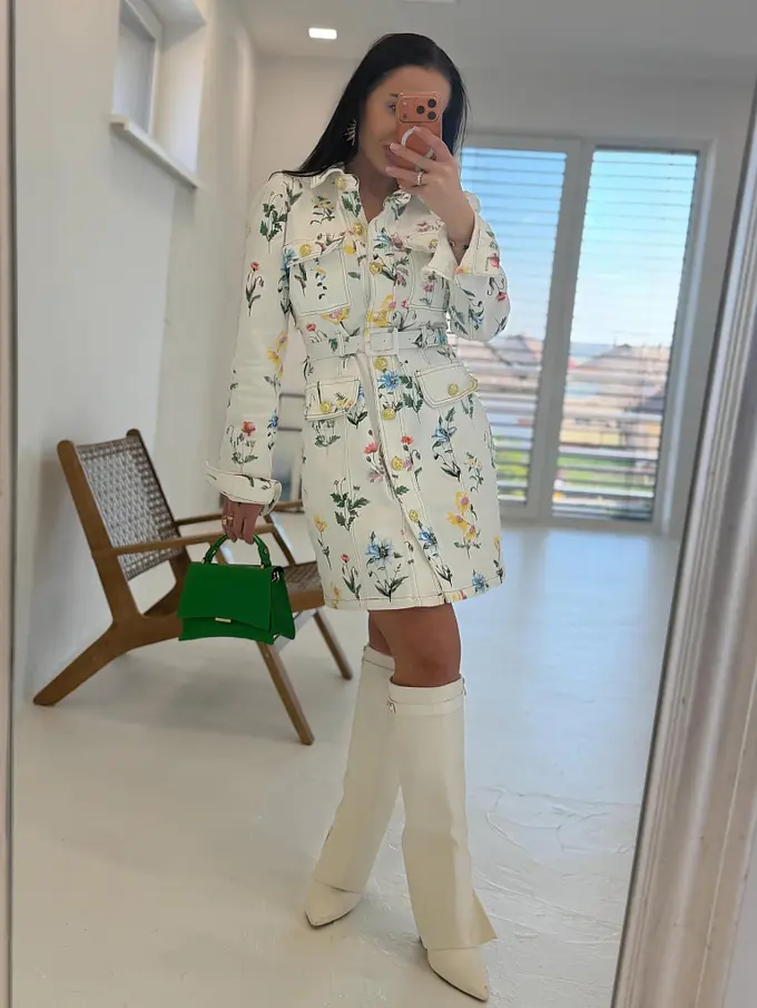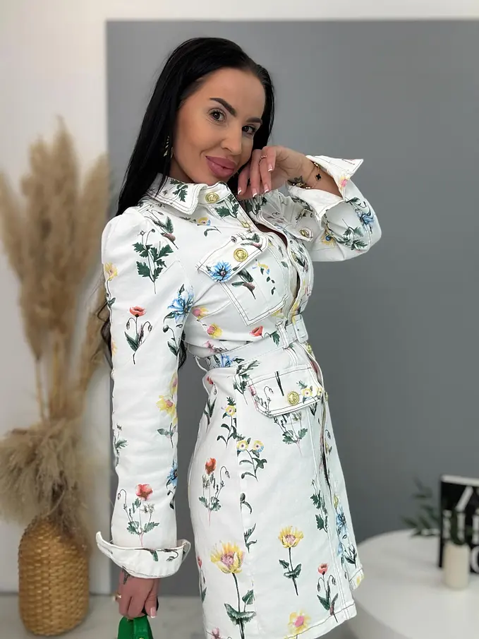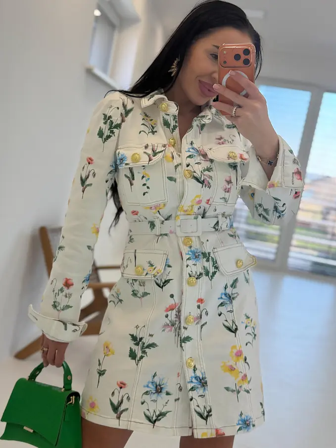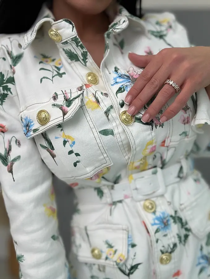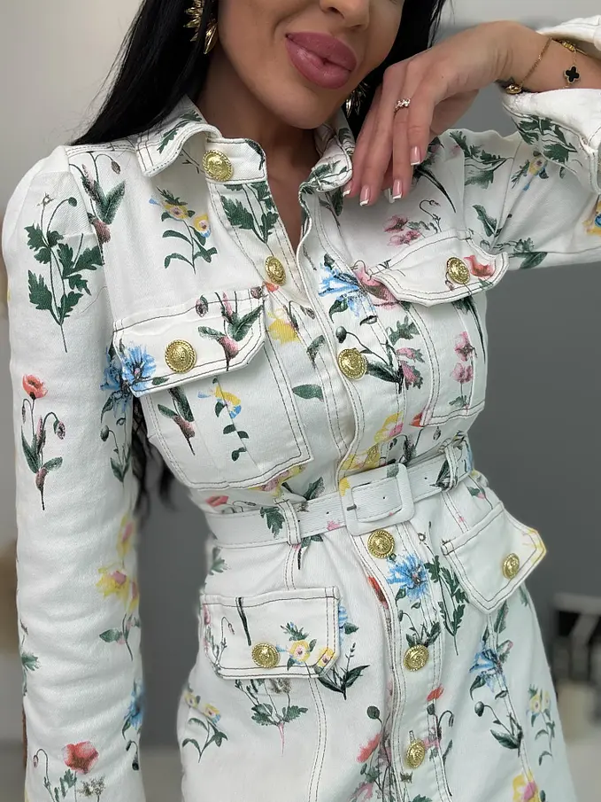 Prémiové šaty priamo z Francúzska. Kvetované rifľové šaty so zlatými gombíkmi a opaskom. Materiál je elastický.