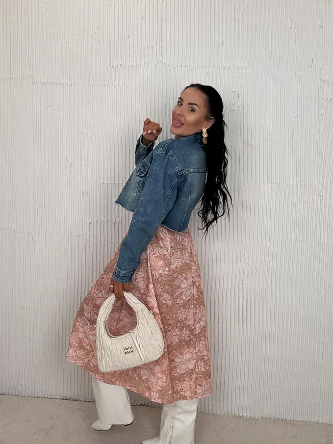 Modelka brunetka meria 158 cm a váží 50kg. Nosí veľkosť S.
