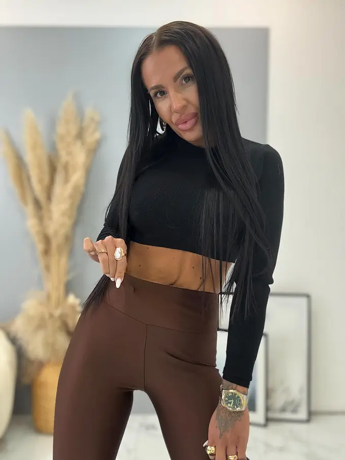 Modelka čiernovláska meria 164 cm a váži 64 kg. Nosí veľkosť M/L. Miery: 99 cm - 74 cm - 93 cm.