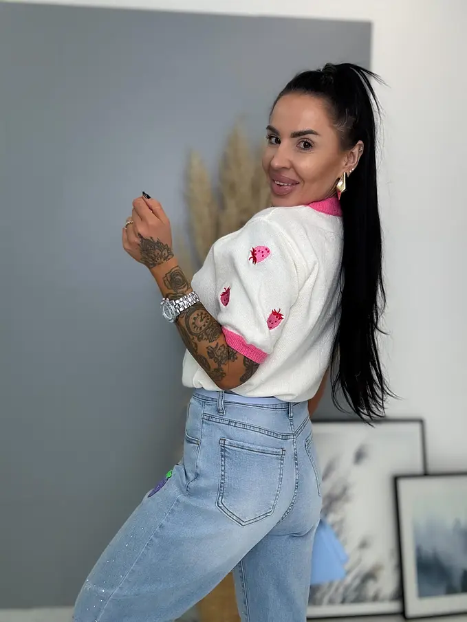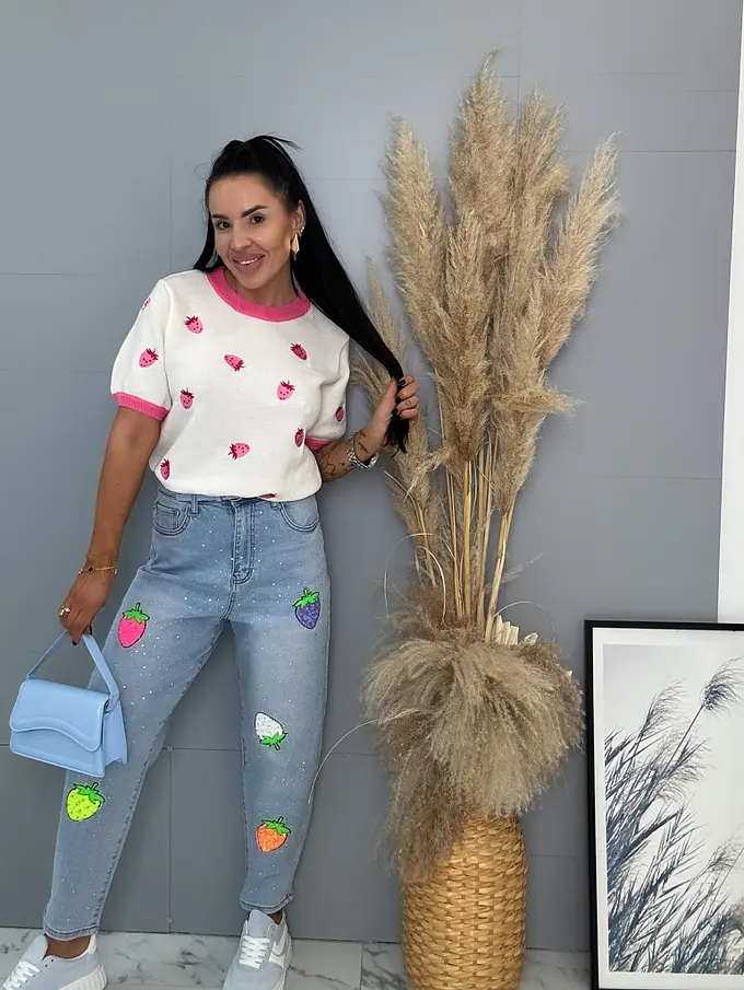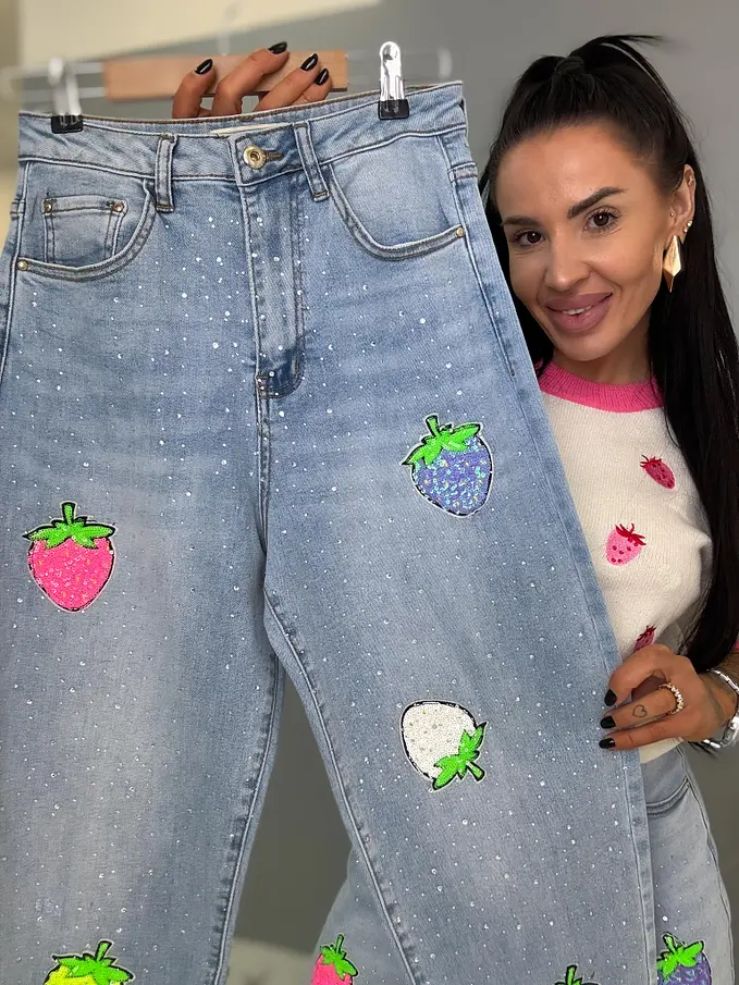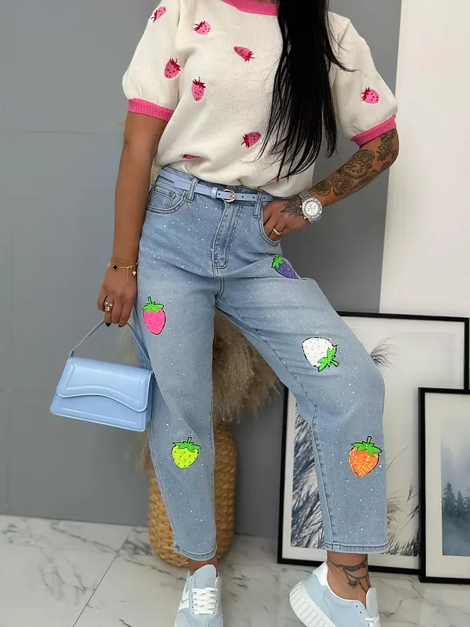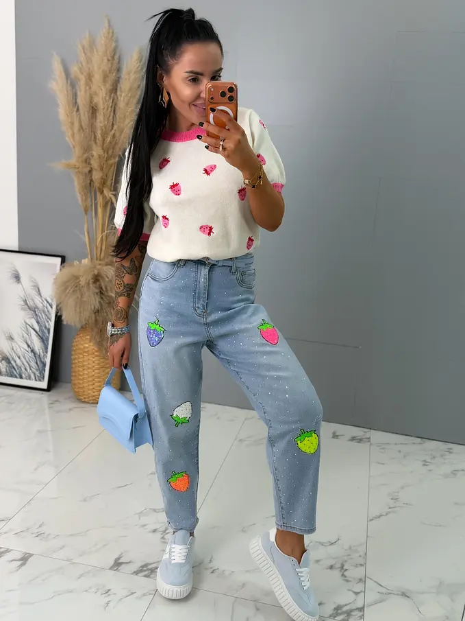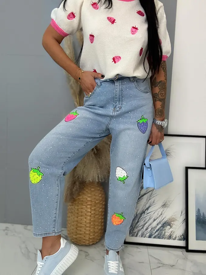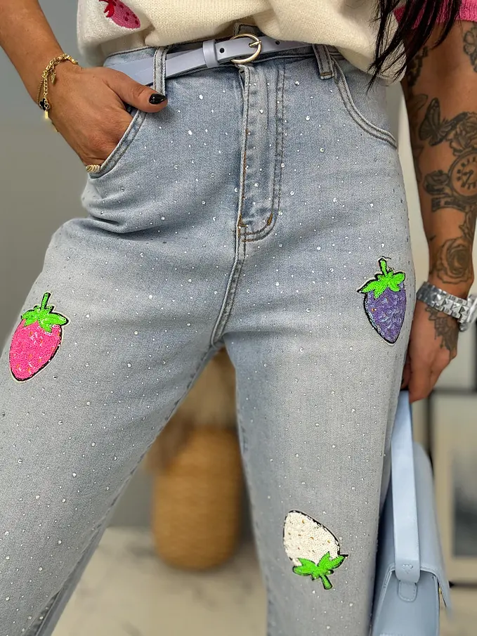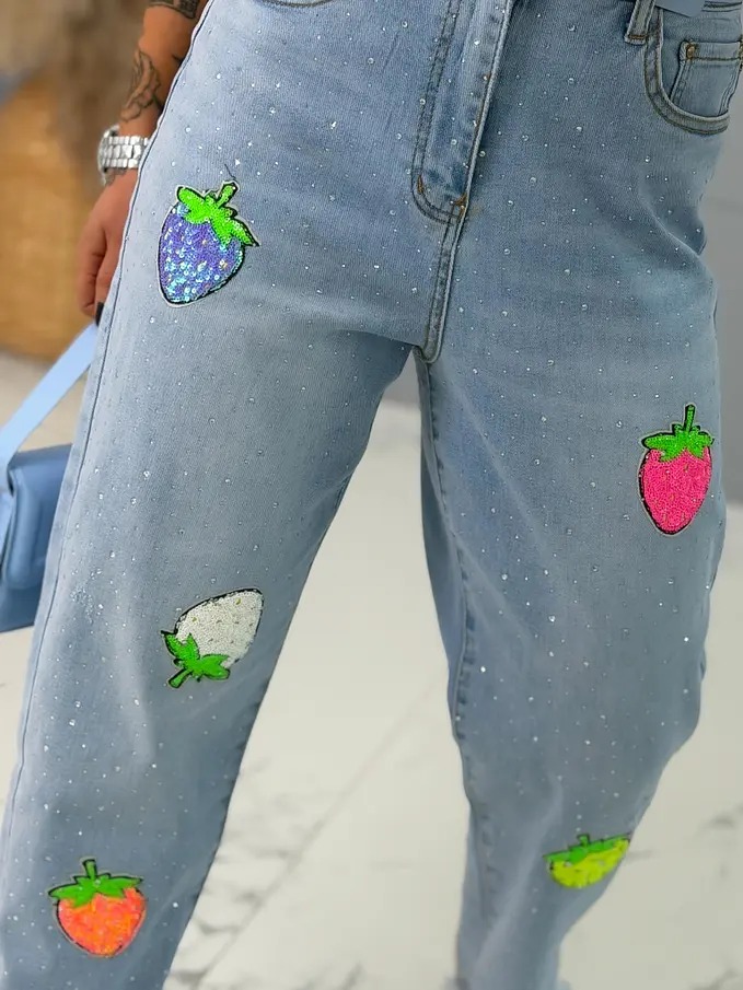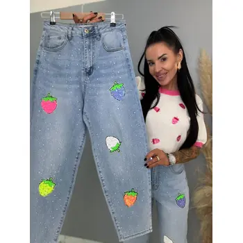 Mom fit rifle s vysokým pásom zdobené kamienkami a flitrami