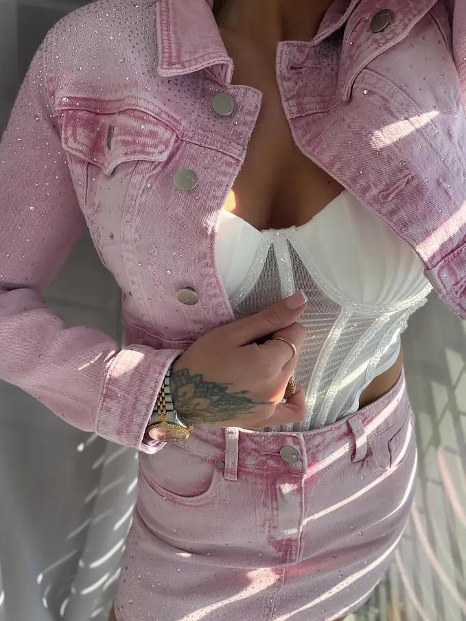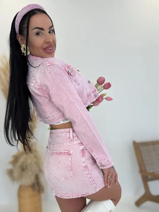 Pink crop denim jacket s kamienkami XENIA