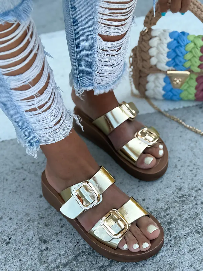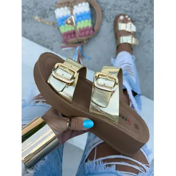 Dámske šľapky na každú príležitosť. Doplnky majú zlatú farbu.