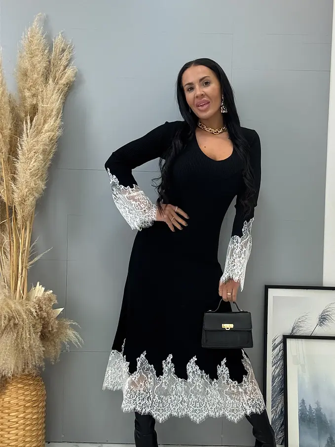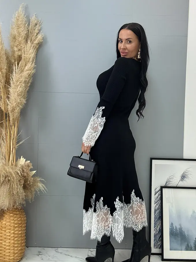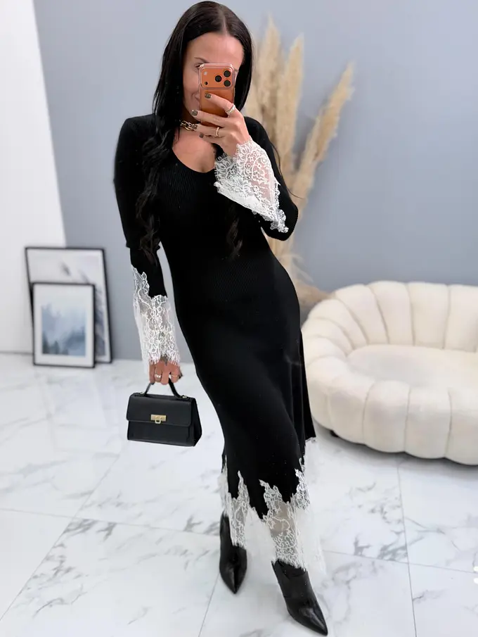 Pletené dlhé šaty z rebrovaného materiálu s čipkou DALEA