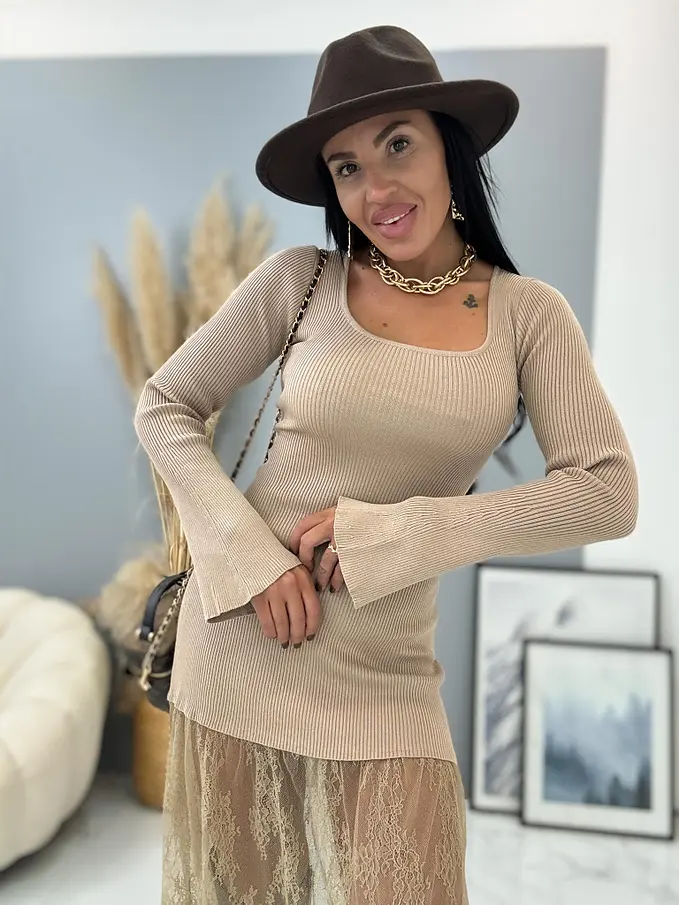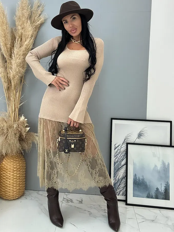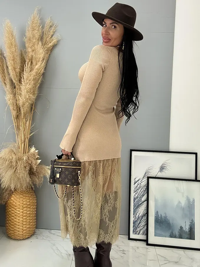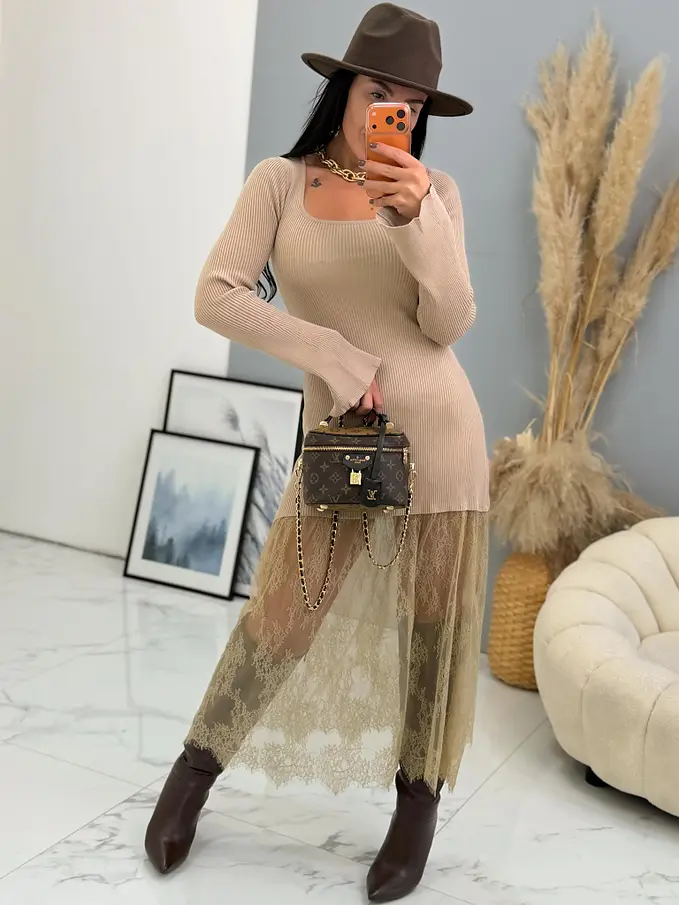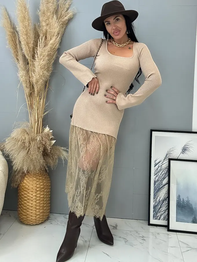 Pletené dlhé šaty z rebrovaného materiálu s čipkou DAYLIN