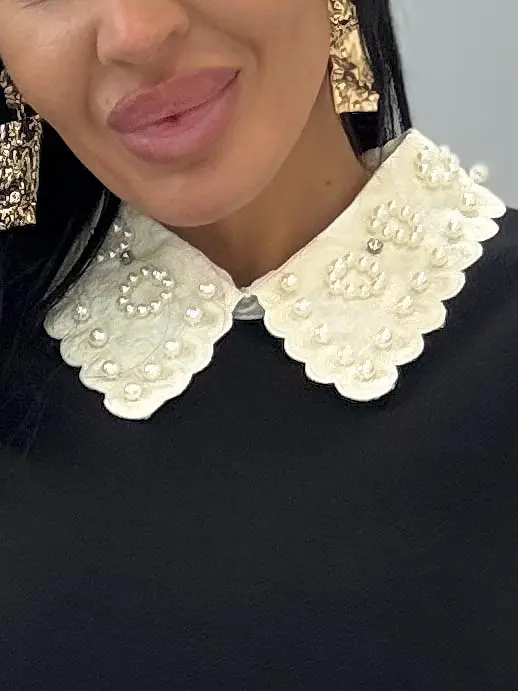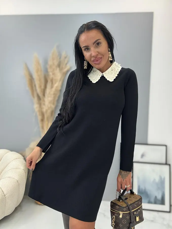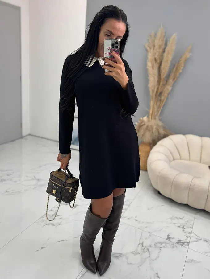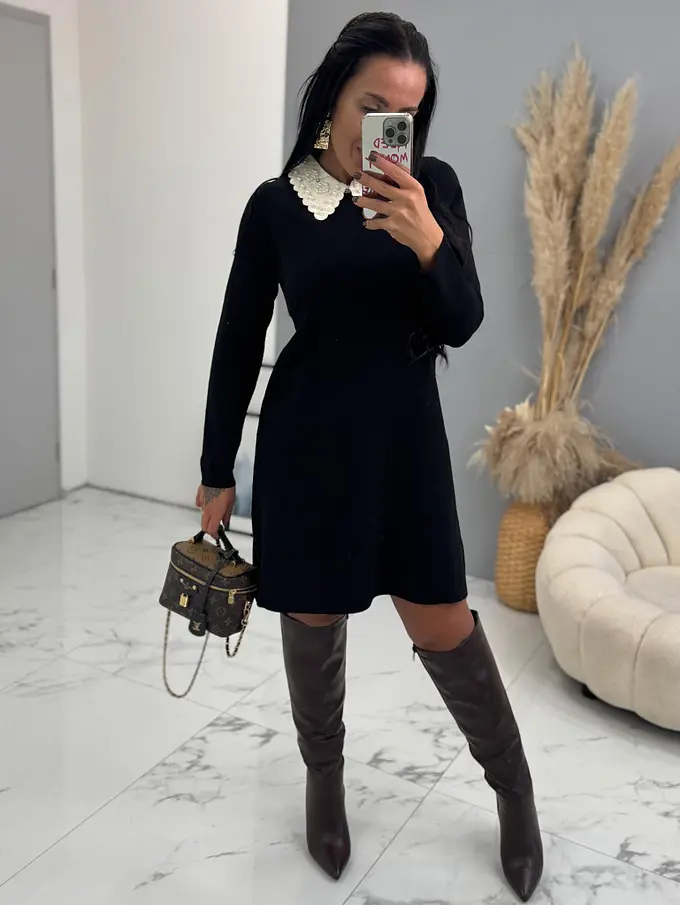 Pletené šaty vyrobené z elastickej látky. Golier zdobia perly.