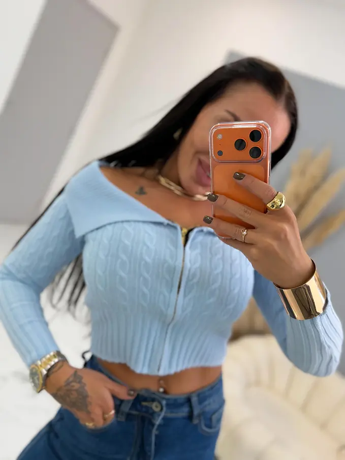 Materiál je elastický. Má dlhé rukávy a zapínanie vpredu na zlatý zips.