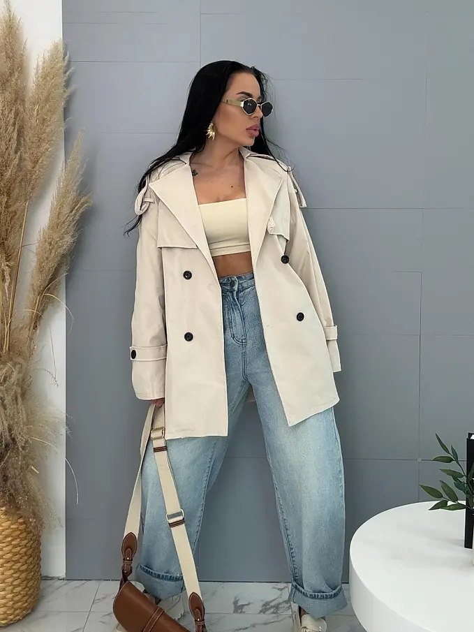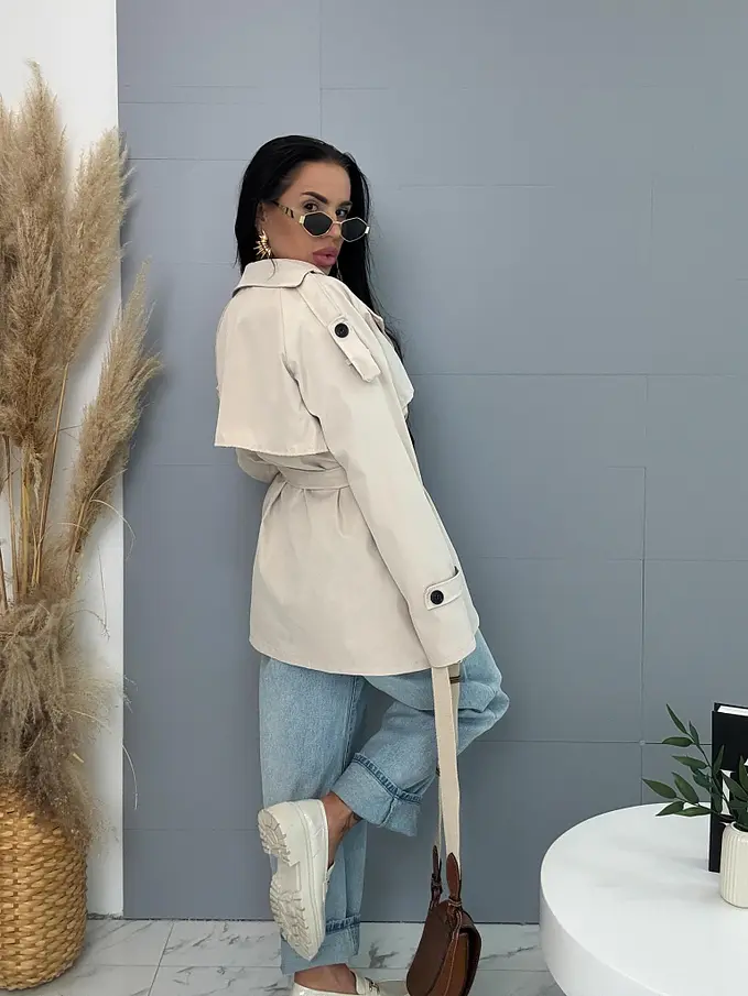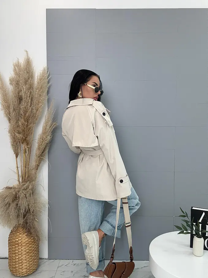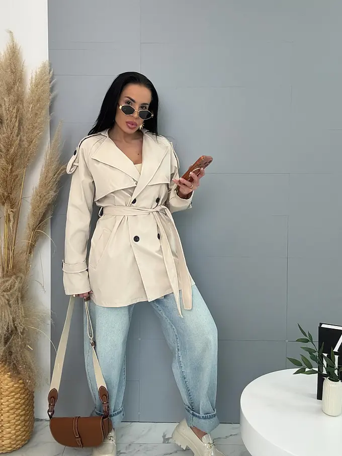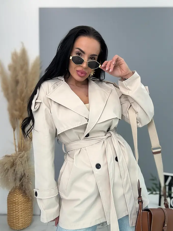 Kabát je vyrobený z príjemného materiálu. Material je veľmi jemne elastiský. S opaskom. Bez podšívky.