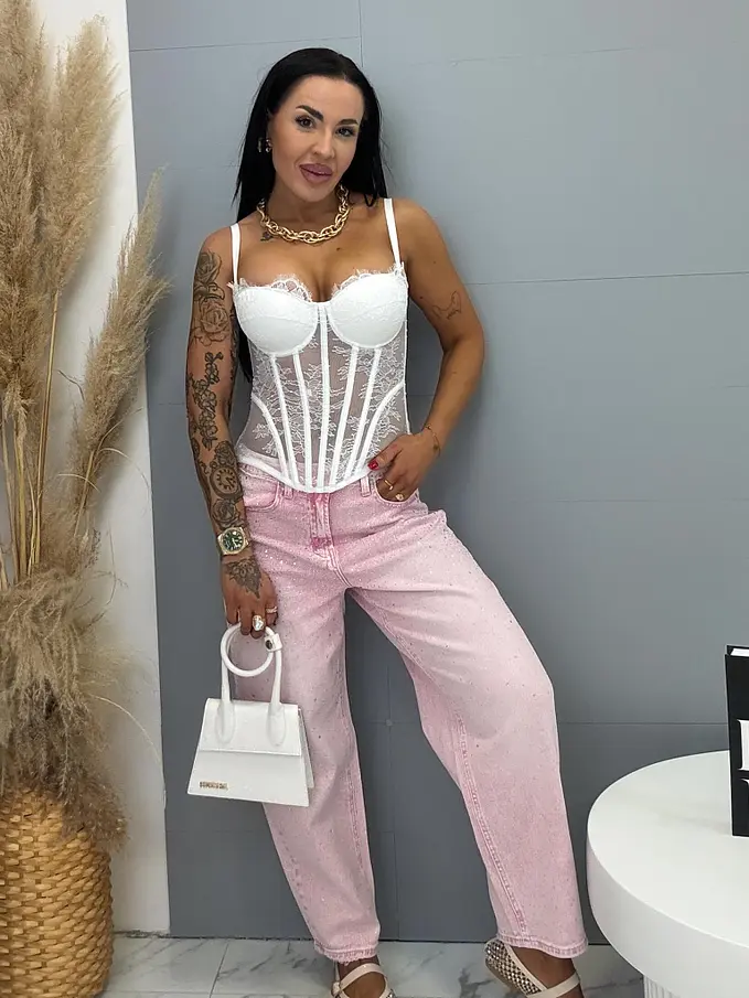 Modelka meria 164 cm a váži 57 kg. Na fotení má na sebe veľkosť S/M.