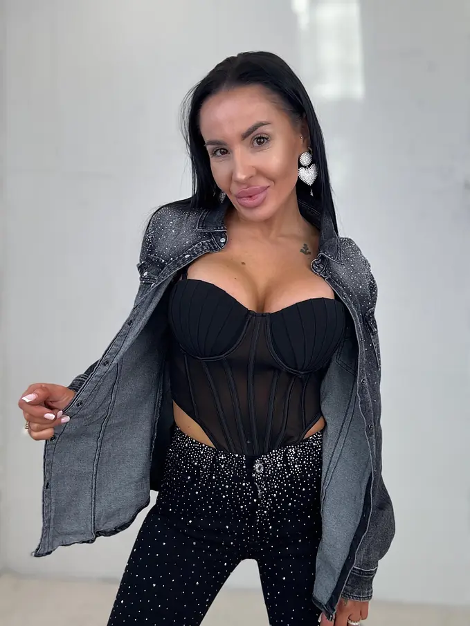 Modelka čiernovláska meria 164 cm a váži 57 kg. Nosí veľkosť S/M.